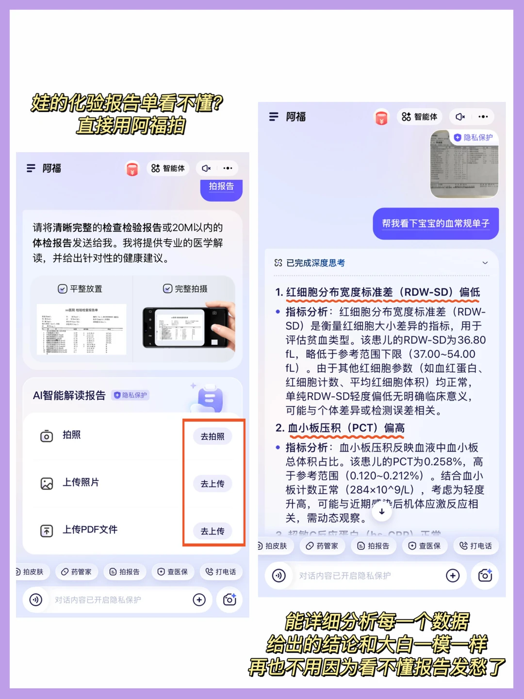 两个娃从出生到现在,体检、生病住院抽过N多回血😭 每次拿到血常规报告,上面一堆密密麻麻的指标看得我头大,想快速抓重点真的太难了!直到用了阿福这个AI健康助手,我才知道通过血常规来判断宝宝情况原来这么简单。