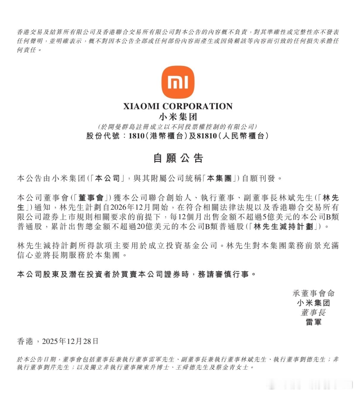 小米联合创始人林斌刚刚公布了新的减持计划,自2026年12月起,每年减持5亿美金,共计不超过20亿美金。我仔细读了一下,未来五年斌总减持额度不到他持有的10%,只有小米1%-2%。从一个万亿公司联合创始人的角度来看,减持的金额和比例都不算多,也是斌总应得的。我还是那个观点:小米最核心的雷总自ipo以来,从来没有在二级市场减持过一股,这才是我们最需要关注的。小米科技