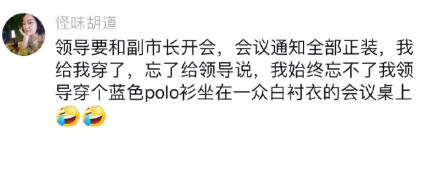 领导要和副市长开会,会议通知全部正装,我给我穿了,忘了给领导说,我始终忘不了我领导穿个蓝色polo衫坐在一众白衬衣的会议桌上