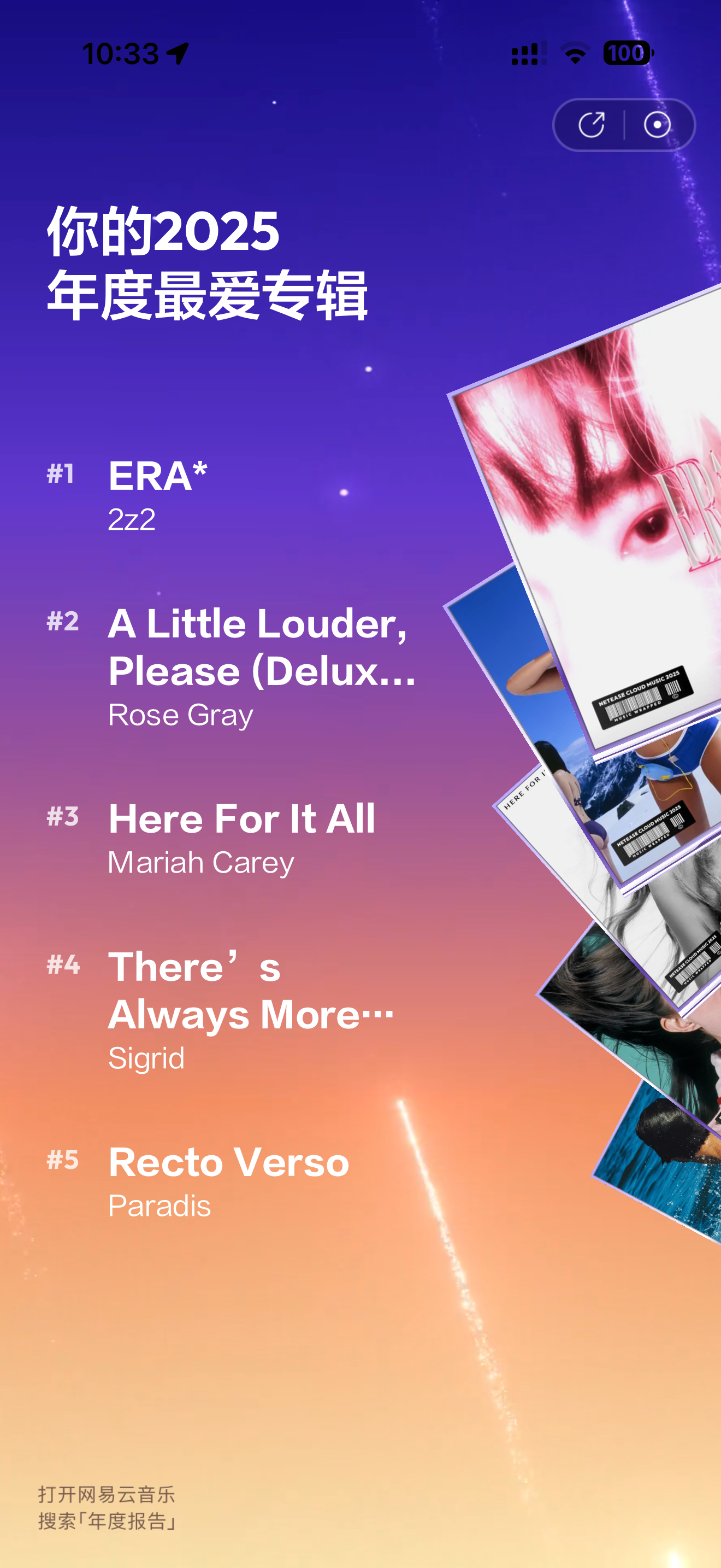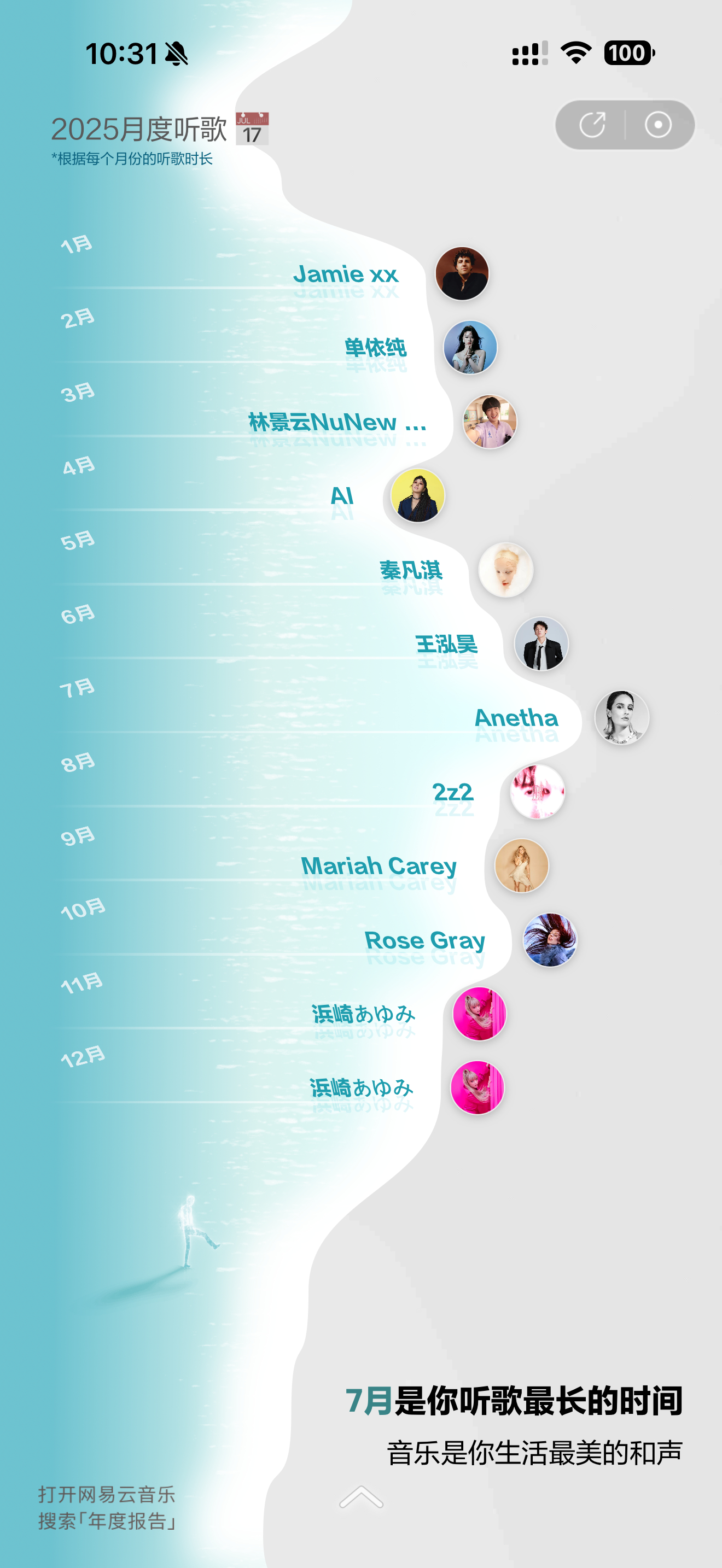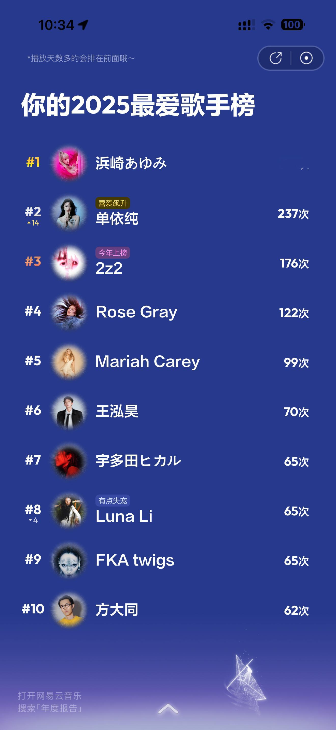 毫无疑问果然因为那事滨崎步又变成了本年我网易云的年度歌手,2z2的专辑成了我听得最多的年度专辑,王泓昊也挺有毒的,他节目现场那几首都好听的不行,到现在也没什么水花,牛姐新专也听了很多遍,宇多田光倒是年年都在榜。