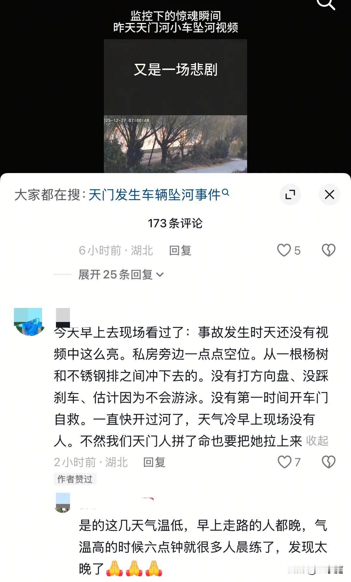 湖北天门,冲入河中的新能源女车主才26岁,她刚拿驾照不久,准备驾驶小车去上班的。没想到,还在半路上,人就出事了。 悲剧是2025年12月27日发生的,当天是周六。早上6点多,女车主就驾驶着车子离开了家门。行经星星大桥与船闸桥附近时,她不慎从马路上冲入了河中。 周边一户居民家的监控,完整记录了车子冲入河道的一幕。 有网友说: 我老婆开车上路,我整整在副驾陪练了一个星期,教她刹车油门下意识快速切换,路口减速,注意预判,现在我是不担心了。 从出事的情况来分析判断,车主虽然是新手,但导致车辆失控冲进河里丢命,不是因为技术问题,而是心理素质差、遇事惊慌失措导致的悲剧。 想当年我在驾校扎扎实实学习了三个月,能熟练操控 车了,拿了驾照之后,又跟了一个货车师傅天南海北的跑了一年,才能独自上路。现如今的驾校只包你拿到驾照,而不管你有没有技术,唉 电车的启动太快,新手根本控制不了。不像油车启动慢些,好控制。女同志开新能源电车,必须熟练才行,否则很危险。