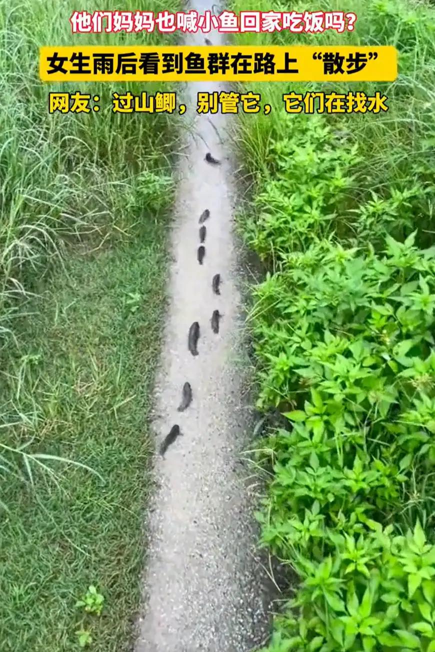 广东,一女子雨后在乡间小路散步,突然看到一个奇怪的现象,路上竟然有一排小鱼在“散
