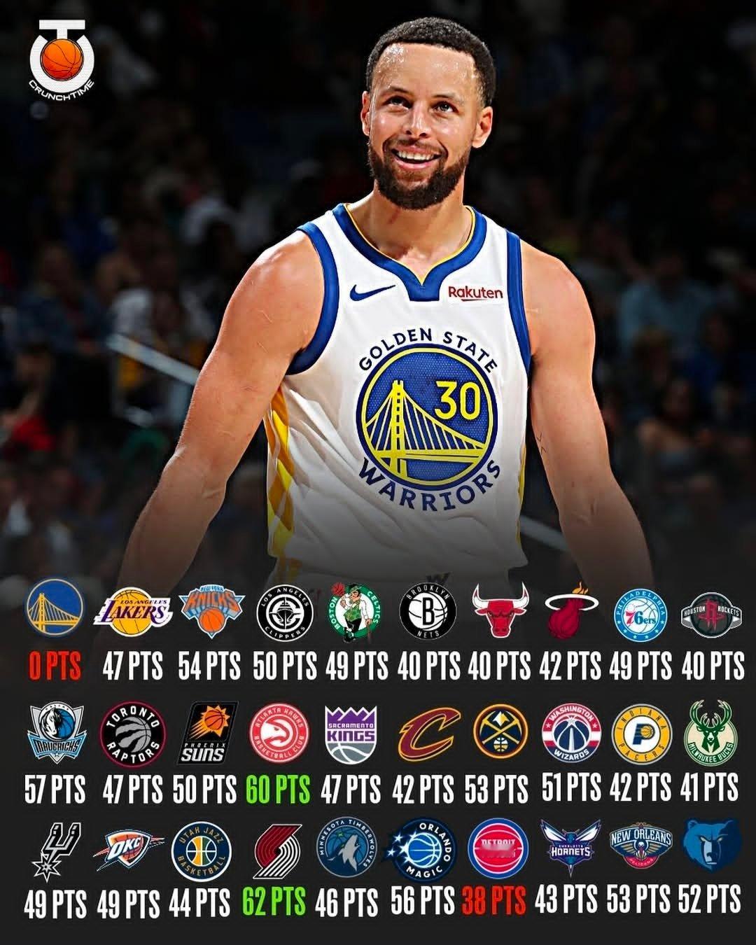 库里目前对阵各队最高得分就差活塞就全部40+了