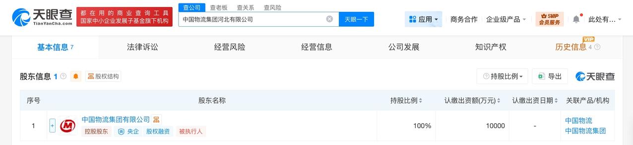 中国物流集团河北公司登记成立注册资本1亿 天眼查App显示,近日,中国物流集团河北有限公司成立,法定代表人为张鸿雁,注册资本1亿人民币,经营范围含道路货物运输、城市配送运输服务、国际货物运输代理、国内货物运输代理、国内船舶代理、包装服务、进出口代理、物联网应用服务、大数据服务、工业互联网数据服务等,由中国物流集团有限公司全资持股。 天眼查信息: