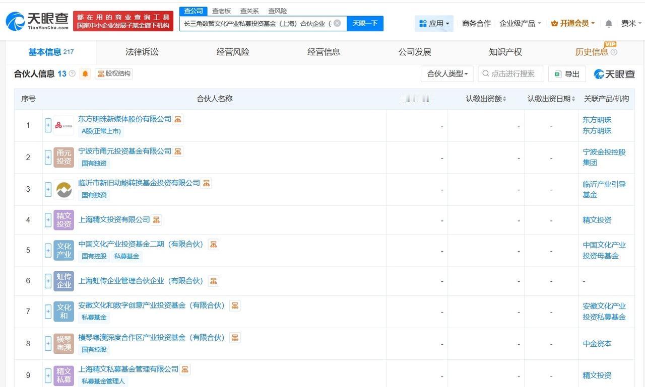 长三角数智文化产业私募投资基金登记成立出资额30.03亿 天眼查App显示,近日,长三角数智文化产业私募投资基金(上海)合伙企业(有限合伙)成立,执行事务合伙人为海通创意私募基金管理有限公司,出资额30.03亿人民币,经营范围为以私募基金从事股权投资、投资管理、资产管理等活动,由东方明珠、宁波市甬元投资基金有限公司、上海精文投资有限公司等共同出资。 据媒体报道,近期,东方明珠发布公告称,该基金规模为100亿元,其中首次封闭目标认缴出资总额为30.03亿元,其将重点投资于人工智能技术为主的核心数字文化技术产业以及“AI+”、“文化+”融合领域。 天眼查信息: