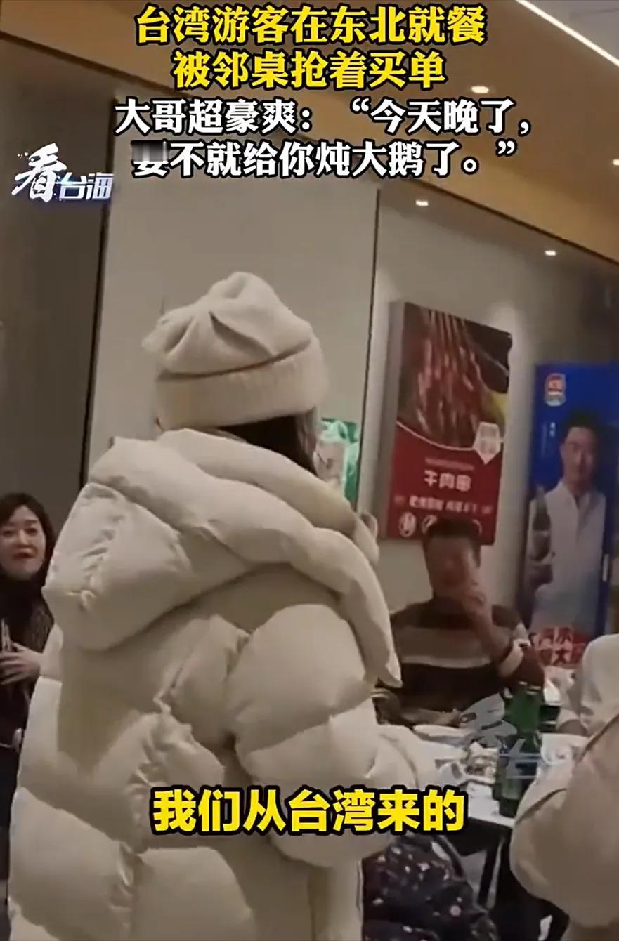 不愧是东北人!台湾女生去东北玩,到餐馆吃饭后准备结账,刚发准备扫码,就被老板挡住,女生很纳闷,老板解释,她吃的东西已经结过账了,原来,邻桌几位大哥知道她来自台湾后,抢先一步把她的单给买了,大哥超豪爽:"今天晚了,要不就给你炖大鹅了。" 这位台湾女生叫小夏,趁着假期来东北体验冰天雪地的乐趣。逛了大半天,冻得手脚发麻,看见街边这家家常菜馆热气腾腾,就推门进去点了锅包肉、酸菜粉条两道东北特色菜。她边吃边举着手机拍照,嘴里还念叨着“比想象中好吃太多”,一口东北话学得有模有样,邻桌几位大哥听着觉得有意思,就主动搭话聊了几句。 得知小夏是从台湾来的,大哥们更热情了,一个劲地给她推荐当地好玩的景点,还叮嘱她出门多穿点,别冻着。小夏没多想,只当是遇到了热心肠的本地人,吃完抹抹嘴准备扫码付款,刚掏出手机就被老板笑着拦住了。 老板指了指邻桌,说那几位大哥早就帮她结完账了。小夏愣了一下,赶紧起身过去道谢,非要把钱转给大哥们。大哥们大手一挥,说啥也不肯收,其中一个嗓门最大的大哥拍着胸脯说:“妹子第一次来东北,必须得让你尝尝咱东北人的热情。今天晚了,后厨大鹅都下架了,要不高低给你炖一只尝尝鲜!” 这话逗得小夏笑出了声,心里暖烘烘的。她本来还担心一个人出门旅行会孤单,没想到一顿饭的功夫,就感受到了东北人骨子里的豪爽。后来她把这段经历发到社交平台,配文说“东北人的热情,像屋里的暖气一样,能把人焐得浑身发烫”。 帖子一发出来,评论区就炸开了锅。台湾网友说隔着屏幕都觉得温暖,大陆网友调侃“这就是东北人,主打一个人不吝”。也有人说,这种发自内心的善意,才是最动人的。其实不管是台湾还是东北,大家都是一家人,这份刻在骨子里的亲切感,从来都不会被距离冲淡。 大哥们的举动看似不起眼,却藏着最朴素的真诚。他们没想着图啥回报,只是单纯想让远道而来的客人,感受到东北的人情味。这份热情,无关地域,无关身份,只关乎一份沉甸甸的同胞情谊。 各位读者你们怎么看?欢迎在评论区讨论。