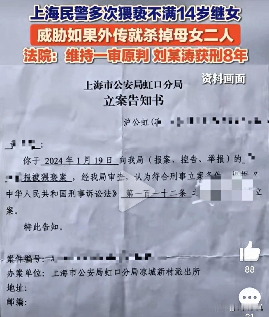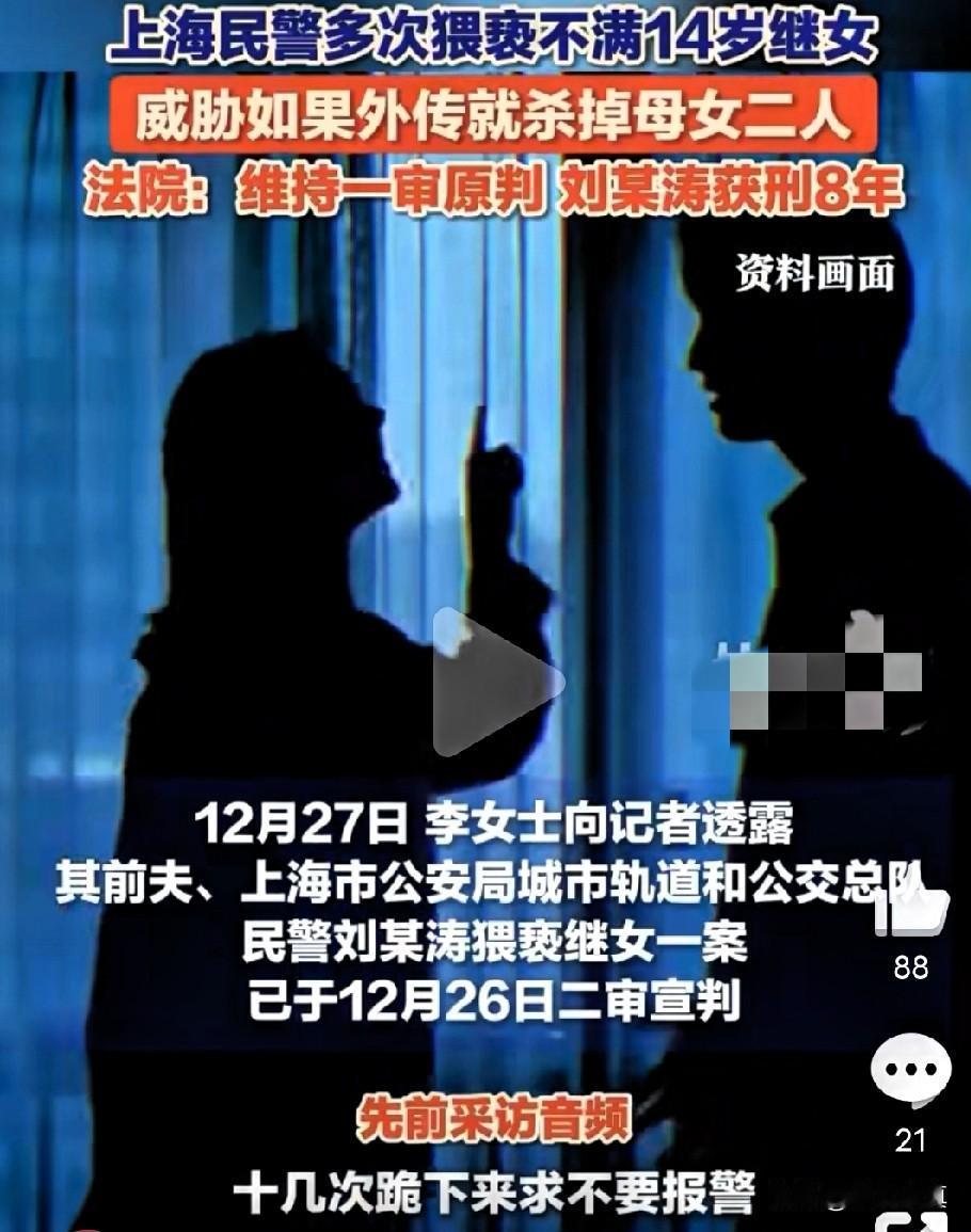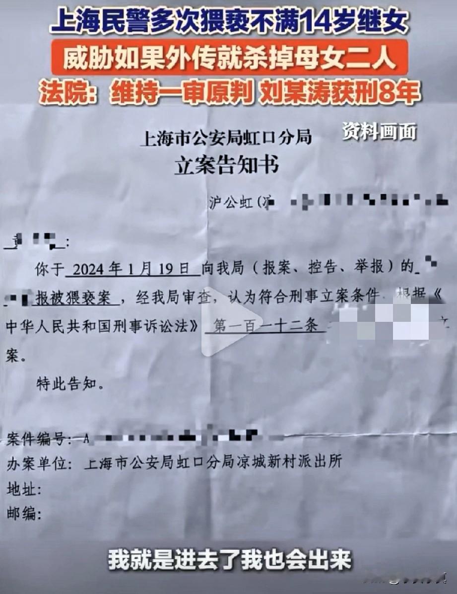 太轻了,8年后出狱,母女生命是否有保障? 上海公安民警强制猥亵继女一案落下帷幕,涉嫌民警两次开庭维持原判,刘民警入狱8年,李女士跟女儿正是逃出魔爪。 据李女士透露:刘民警曾经扬言恐吓他们母女俩,如果事情暴露了,会第一时间死了他们母女俩人,想想就害怕,如果8年后凶手出狱了,李女士母女是否还敢在上海工作跟居住吗?希望刘民警出狱后能改过自新,不要在打扰别人的生活了