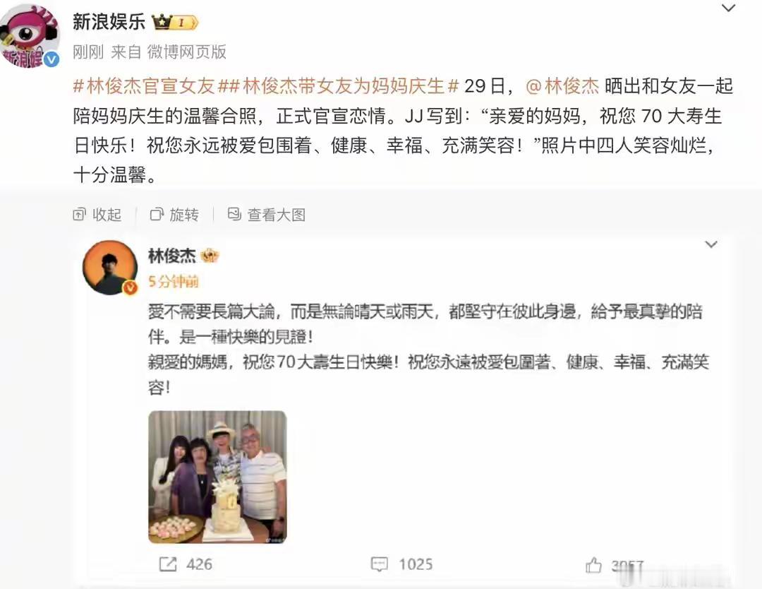 林俊杰官宣恋情:44岁音乐才子与24岁艺术才女的成熟之恋引全网祝福! 12月29日,华语乐坛“行走的CD”林俊杰在微博发布一张四人合照,配文为母亲庆生,照片中女友“七七”(Annalisa)首次正式亮相,瞬间被解读为“突袭式官宣恋情”,评论区满是祝福。 此次官宣并非毫无预兆,2025年11月25日,网友在洛杉矶碰到林俊杰与一年轻女性,穿情侣装并肩同行互动亲昵,当时林俊杰未回应,其社交动态专注音乐合作,反倒赢得“恋爱与事业平衡典范”的称许。 合照曝光后,女方身份被挖,24岁的七七是美国帕森斯设计学院在读留学生,网传她家境好,在多地有多处豪宅。知情者透露,两人低调交往近两年,林俊杰赴美工作时经常住在女方家。七七能力也非常强,她参与过儿童艺术基金设计项目,还和林俊杰一起匿名捐百万善款支持音乐教育扶贫,因此被网友称为“才貌双全的公益情侣”。 官宣后林俊杰社交账号评论区满是祝福,粉丝翻出他2013年演唱会上向田馥甄表白的视频感慨从《修炼爱情》到《将故事写成我们》,终于碰到对的人,有人整理他感情经历制作出“从意难平到圆满”的混剪视频弹幕飘满“你幸福就好” 林俊杰出道已经二十二年,首次公开恋情的时候,态度挺坦然,粉丝们的反应大体较理性,很少出现脱粉或者反噬状况,正如网友所言:大伙钟爱的是他的音乐,恋爱不算塌房,反而给那音乐故事增添了新的篇章。 官方宣布了,粉丝们一直很期待林俊杰的新作品,他曾在《可惜没如果》里表达遗憾,在《将故事写成我们》中展现承诺,如今生活幸福美满,他的音乐创作或许会更具温情。 七七的艺术背景,也为这段关系增添了几分想象空间,倘若两人携手展开跨界合作,或许真能激发出别具一格的火花,正如今日网友调侃所言:“往后JJ的情歌MV,女主角恐怕都得由她亲自设计了。” 从洛杉矶偶遇,到全家福官宣,林俊杰花两年书写“成熟男士的浪漫故事”,在这没喧闹、没炒作的恋情里,既是有才华的音乐人,也是会平衡生活的平凡者,恰似他在微博的祝福“永远被爱围绕”,这爱来自女友、粉丝和音乐。点个爱心支持一下!欢迎评论区留言!❤️林俊杰