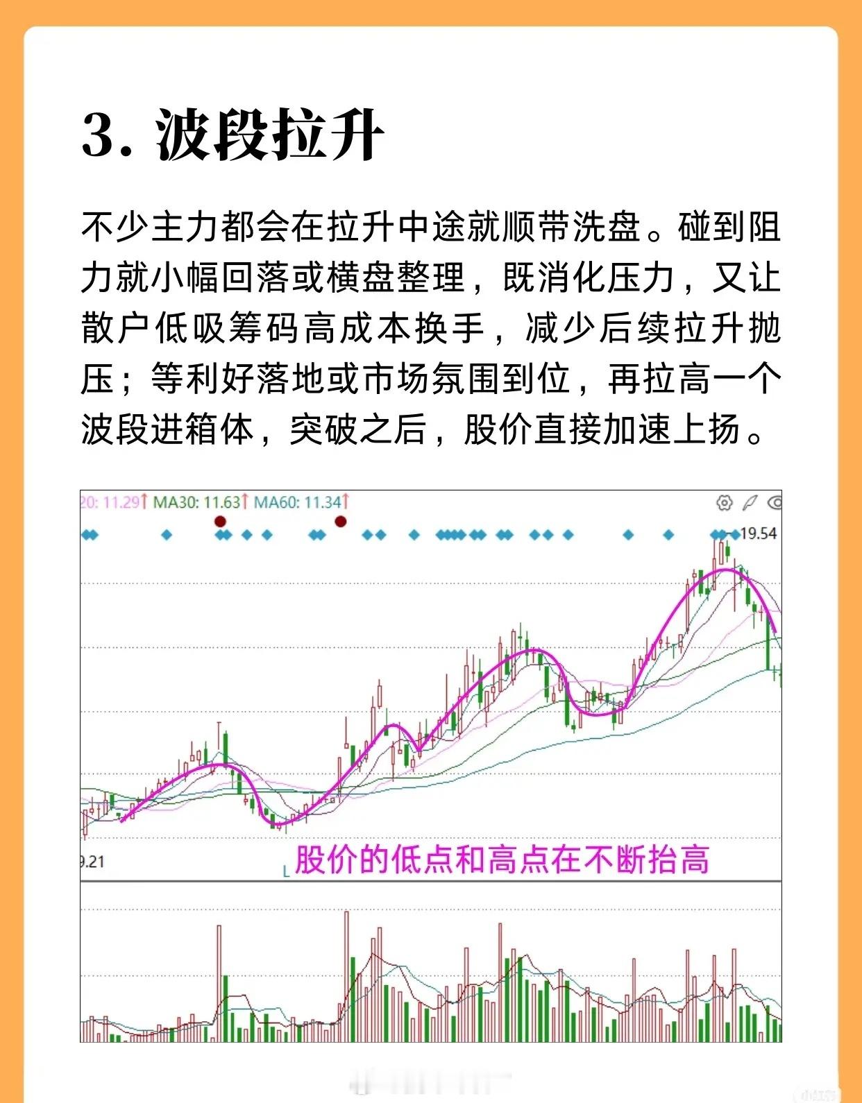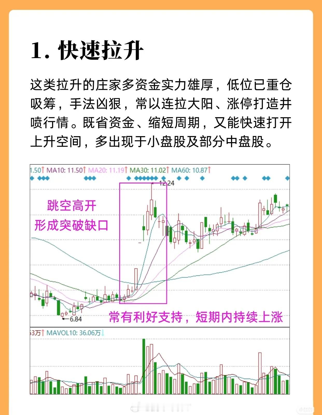 股票拉升阶段的走势,讲解了五种拉升类型:1. 快速拉升:由资金雄厚的庄家操作,常通过连拉大阳、涨停制造井喷行情,多出现于小盘及部分中盘股,通常有跳空高开形成的突破缺口,且常有利好支持,短期内持续上涨。2. 台阶拉升:股价上涨后先经平台或强势整理、完成清洗或获利盘换手,再再度拉升,呈现台阶状步步高升的形态;多由实力较强的主力运作基本面优良的绩优股,操作风格稳健。3. 波段拉升:主力拉升中途会伴随洗盘,遇阻力时小幅回落或横盘整理,以消化上涨压力、促使散户高成本换手,减少后续抛压;待利好落地或市场氛围好转,再拉高一个波段进入箱体,突破箱体后股价往往快速上扬,整体表现为低点和高点不断抬高。4. 斜角拉升:主力按固定斜率直线拉升,盘口有大单托底彰显实力,拉升过程中会回踩诱使散户低吸,之后再快速拉高;能如此运作的主力实力不弱,出货时还会搭配上市公司题材助力。5. 圆弧拉升:主力底部吸足筹码后启动慢涨,初升期阴阳交替、节奏平缓,随后量价适配,涨速逐步加快、斜率变陡直至行情冲刺,全程呈圆弧上行形态,初期缓慢、后期势头迅猛。