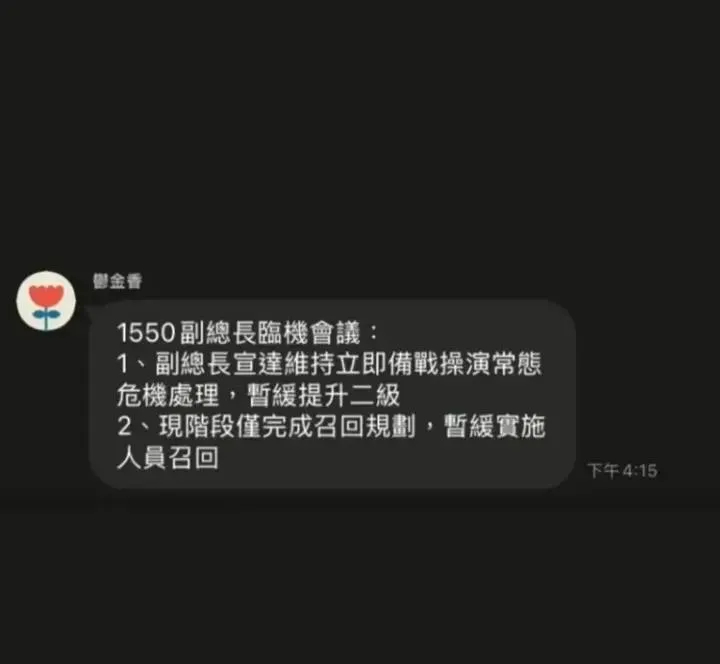 🔻台湾省网友分享:🔻笑死,台伪军“总长”下午三点半要求台伪军全员召回,开始二级加强戒备(图1)。🔻“全網的職軍都在召回,誇張的只給30分鐘,脆隨便一滑都是軍眷不捨送別,弟兄們休假中匆忙返營”(图1)🔻结果,“副总长”下午三点五十要求暂缓召回,二级加强戒备暂停(图3)。🔻听谁的?🔻乱成一锅粥。东部战区随时到台北台中突然大规模停电热点现场
