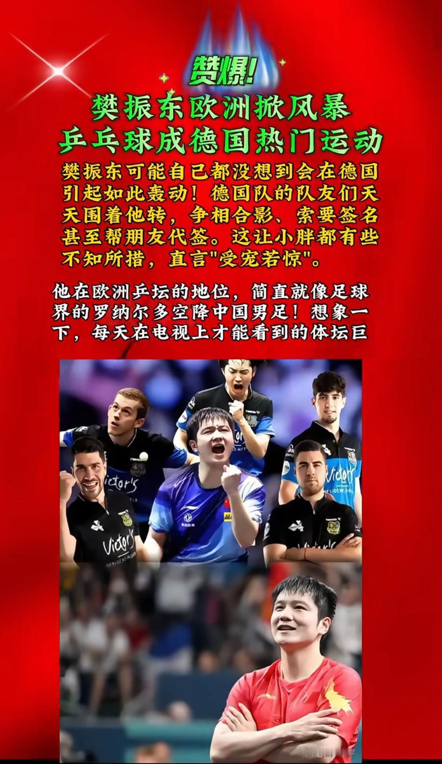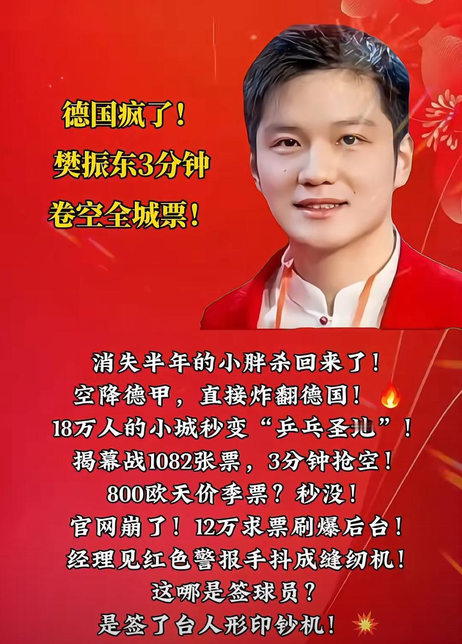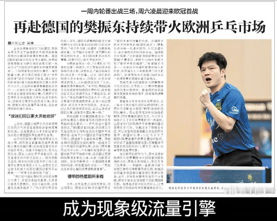 德甲变"顶流": 樊振东一人引爆欧洲,票价狂翻7倍! 樊振东登陆德国, 萨尔布吕肯一票难求, 票价从25欧元飙升至180欧, 当地旅游业顺势 推出“观赛+莱茵河”套餐, 餐馆纷纷挂起中文菜单, 营业额激增40%。 他以唯一亚洲面孔登陆赛事海报, 与瓦尔德内尔、波尔并肩传奇。 一个中国乒乓球运动员, 在德国将乒乓球打成顶流运动。 从全运夺冠到德甲狂潮, 从摄影获奖到商业引爆, 樊振东以球拍作答。 当欧洲高呼“我们的东”, 当德媒赞其超越梅西, 当千人因他沸腾一一 这不仅是一千人的荣耀, 更是中国力量的强势输出, 是民族自信的热血共鸣, 是十四亿人民的骄傲! 他用实力宣告: 中国运动员走到哪里, 哪里就有传奇, 哪里就有狂热。 中国速度,中国力量, 热血永燃!