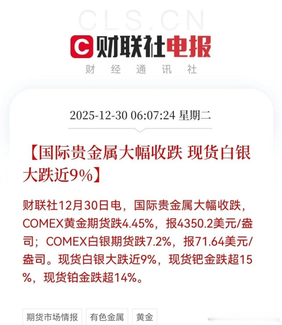 早上6点40分!简直不敢相信自己的眼睛!三根放量大阴线砸醒了多少梦中人…万万没有想到,暴风雨来得如此之快,昨夜凌晨贵金属全线崩盘了,黄金期货大跌4.45%,白银期货大跌7.2%,铜期货大跌4.61%,贵金属大跳水,阴包阳,又是历史高位的位置,预示着这或许不是一次短期调整,而是一根反转的大阴线,请系好安全带!