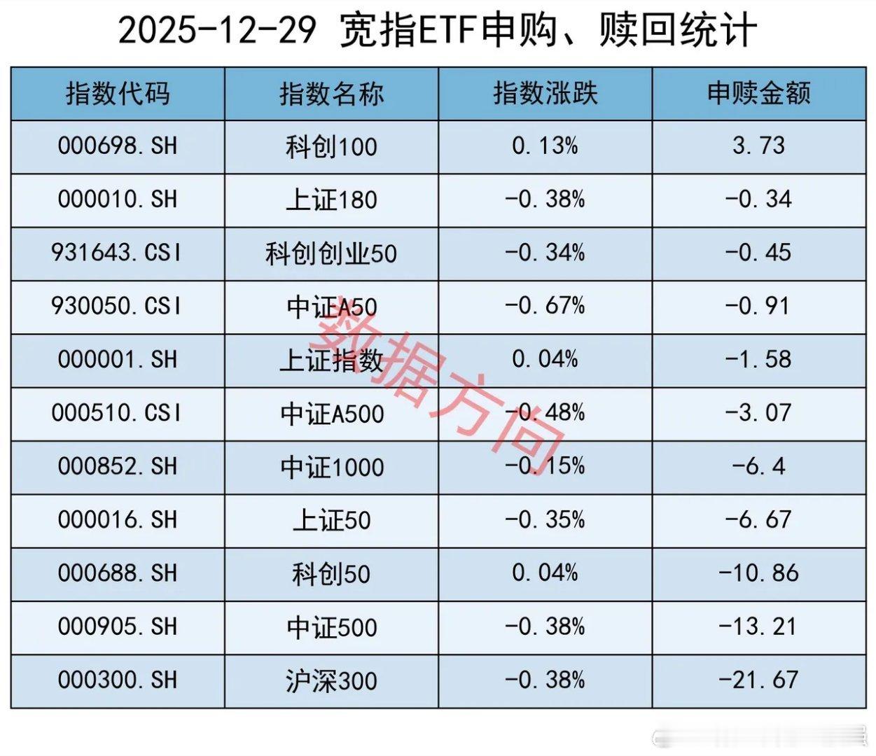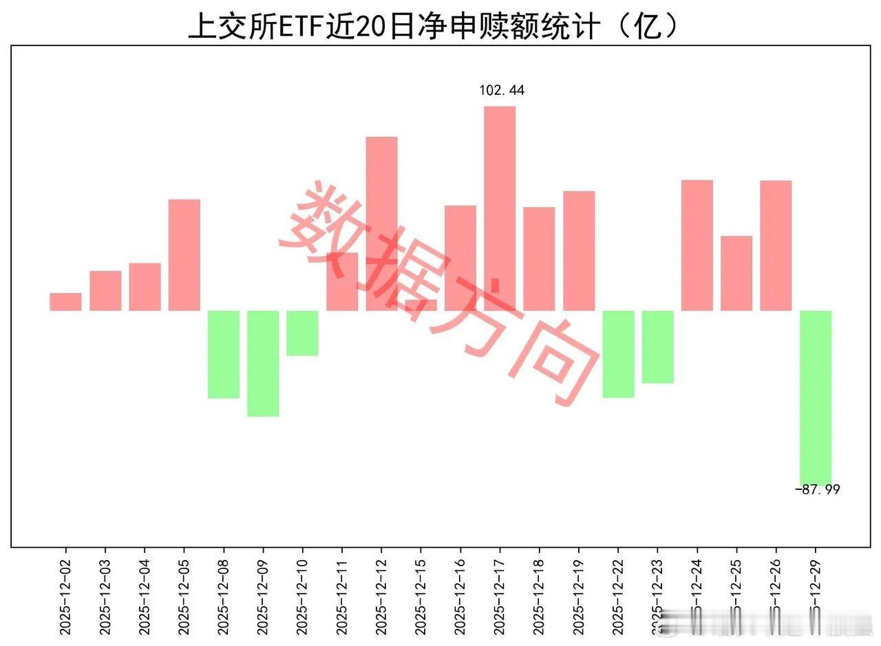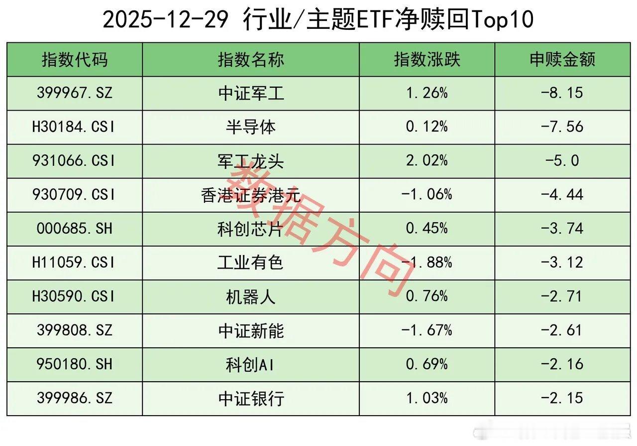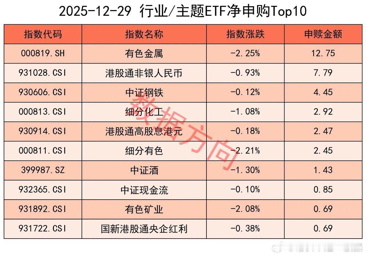 上交所ETF净赎回88亿12月29日星期一,大盘震荡整理,航天商业、机器人、油气等涨幅居前。上证指数涨幅0.04%,上交所ETF合计净赎回87.99亿元,这是近5周以来单周净赎回最多的一次。宽指仅有科创100指数(3.73亿)获净申购。沪深300指数(-21.67亿)、中证500指数(-13.21亿)、科创50指数(-10.86亿),净赎回超过10亿;上证50指数(-6.67亿)、中证1000指数(-6.4亿),净赎回超过5亿;中证A500指数(-3.07亿)、上证指数(-1.58亿)、中证A50指数(-0.91亿)、科创创业50指数(-0.45亿)、上证180指数(-0.34亿),分别被小幅净赎回。在以前的经验里面,当所有宽指全部被净赎回的时候,通常是不好的短期信号,昨天仅一个获净申购。行业和主题 有色金属指数(12.75亿)、中证钢铁指数(4.45亿)、细分化工指数(2.92亿)、细分有色指数(2.45亿)、有色矿业指数(0.69亿),一起进入申购榜。港股通高股息港元指数(2.47亿)、中证现金流指数(0.85亿)、国新港股通央企红利指数(0.69亿),一起进入申购榜。其他进入申购榜的还有:港股通非银人民币指数(7.79亿)、中证酒指数(1.43亿)。中证军工指数(-8.15亿)、军工龙头指数(-5.0亿),一起进入赎回榜。半导体指数(-7.56亿)、科创芯片指数(-3.74亿),一起进入赎回榜。其他进入赎回榜的还有:香港证券港元指数(-4.44亿)、工业有色指数(-3.12亿)、机器人指数(-2.71亿)、中证新能指数(-2.61亿)、科创AI指数(-2.16亿)、中证银行指数(-2.15亿)。ETF