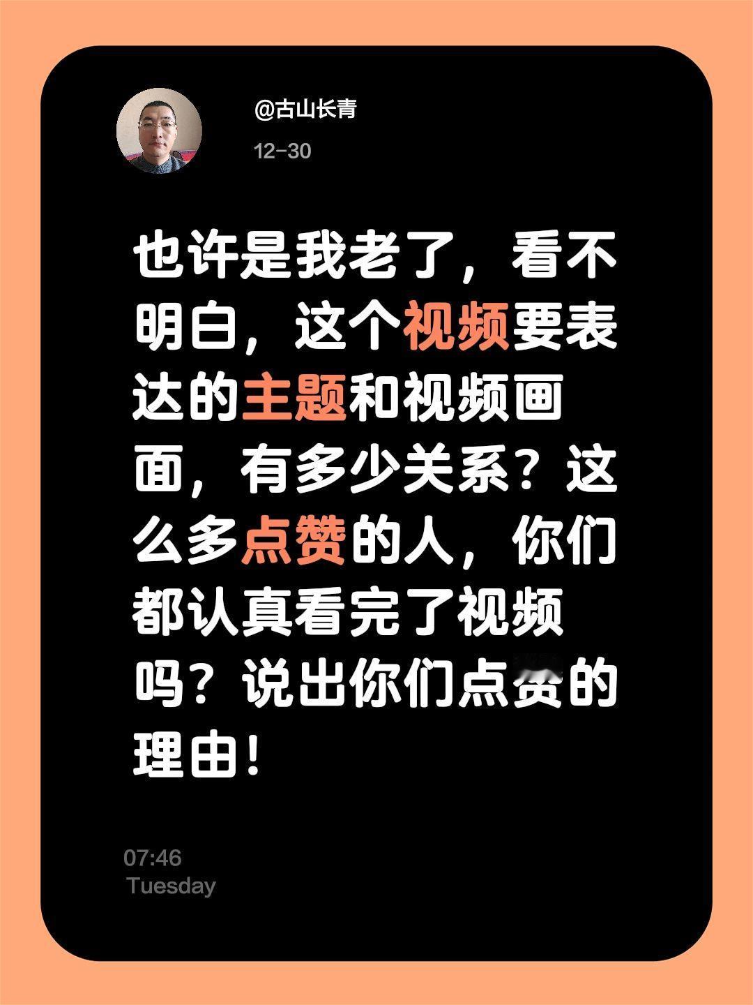 我评论了@小水水iii 的作品: 也许是我老了,看不明白,这个视频要表达的主题和视频画面,有多少关系?这么多点赞的人,你们都认真看完了视频吗?说出你们点赞的理由!