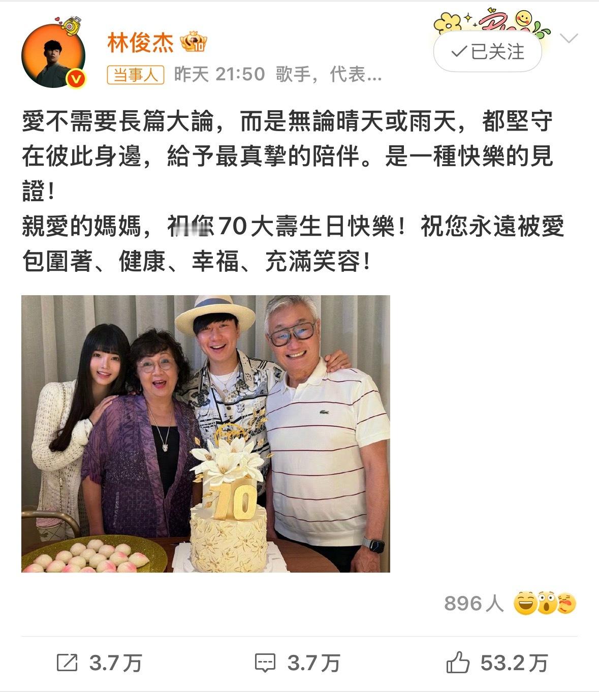 林俊杰官宣恋情昨天,晒出和女友一起陪妈妈庆生的温馨合照,正式官宣恋情💘