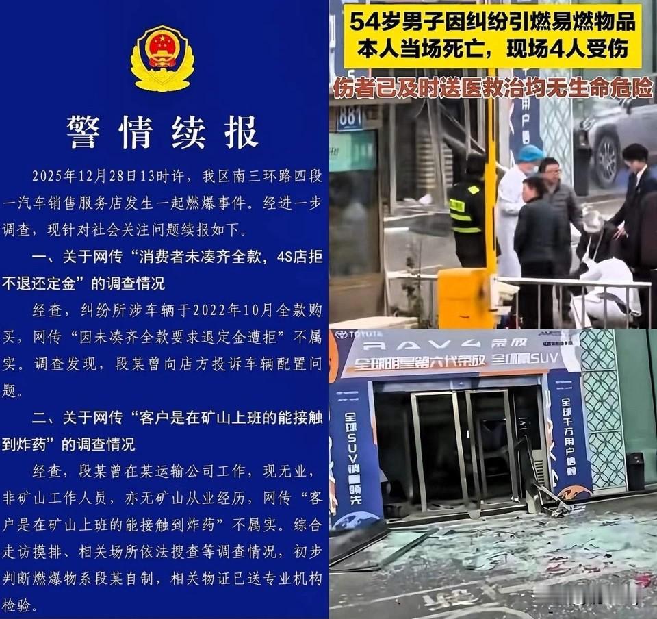 成都4S店燃爆原因,并不是因为段某2万元的定金4S店不给退,据警方调查而是因为车辆配置问题! 段某2022年全款买车后,发现车辆配置与当初销售承诺的完全对不上,多次找到店家沟通一直无果! 事件没有得到妥善的解决!导致矛盾一步步升级!段某一时糊涂走上了极端! 燃爆物也不是段某从矿上拿的,段某也不是矿工,以前是运输公司的工人,现在无业! 其中一名员工伤得比较严重,全身重度烧伤,光植皮就需要几十万元,后期的治疗费用加上康复不知道要花多少钱! 现在这种局面,不知店老板得有多后悔!如果当初要早解决矛盾不推诿,哪会走到这样的地步,做生意得守诚信,别等出事了追悔莫及!