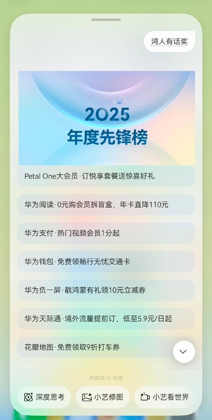 HarmonyOS6 12月30日,HarmonyOS 6 功能推荐重磅发布!这次更新功能多到眼花缭乱?有好玩的、好用的还有用起来绝对安全放心的!几项大奖实至名归【伸手就来奖】抢红包姿势大升级!华为支付红包隔空抓取,手一伸,好运自动来,告别疯狂点击,现在拼的是“气场”【“灵机”一动奖】照片也能动起来?AI一键成片功能让你的静态瞬间秒变动态大片,不仅修图快,发朋友圈更是可以收获无数点赞【赛博老乡奖】小艺居然“变身”老乡了!小艺方言自由说,不管是粤语、四川话还是你的家乡话,它都能接得住,聊天亲切感拉满【安全放心奖】AI防窥保护、分享内容加密、亲情呼叫防诈等等。安全防护专家24小时保护你的手机安全想体验更多?长按华为手机电源键唤醒小艺,说 “鸿人有话奖”还有更多惊喜等着你!用了就回不去的手机功能