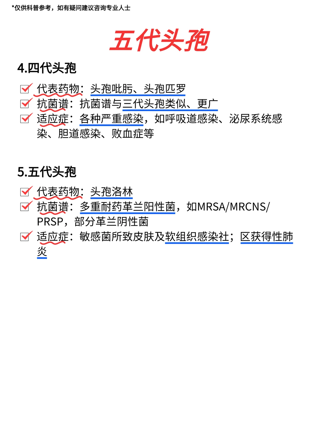 宝子们,头孢是临床常用的一类抗菌药,已经发展到第5️⃣代了,今天就用1️⃣张图来和宝子们复习一下各代头孢的区别and使用注意~