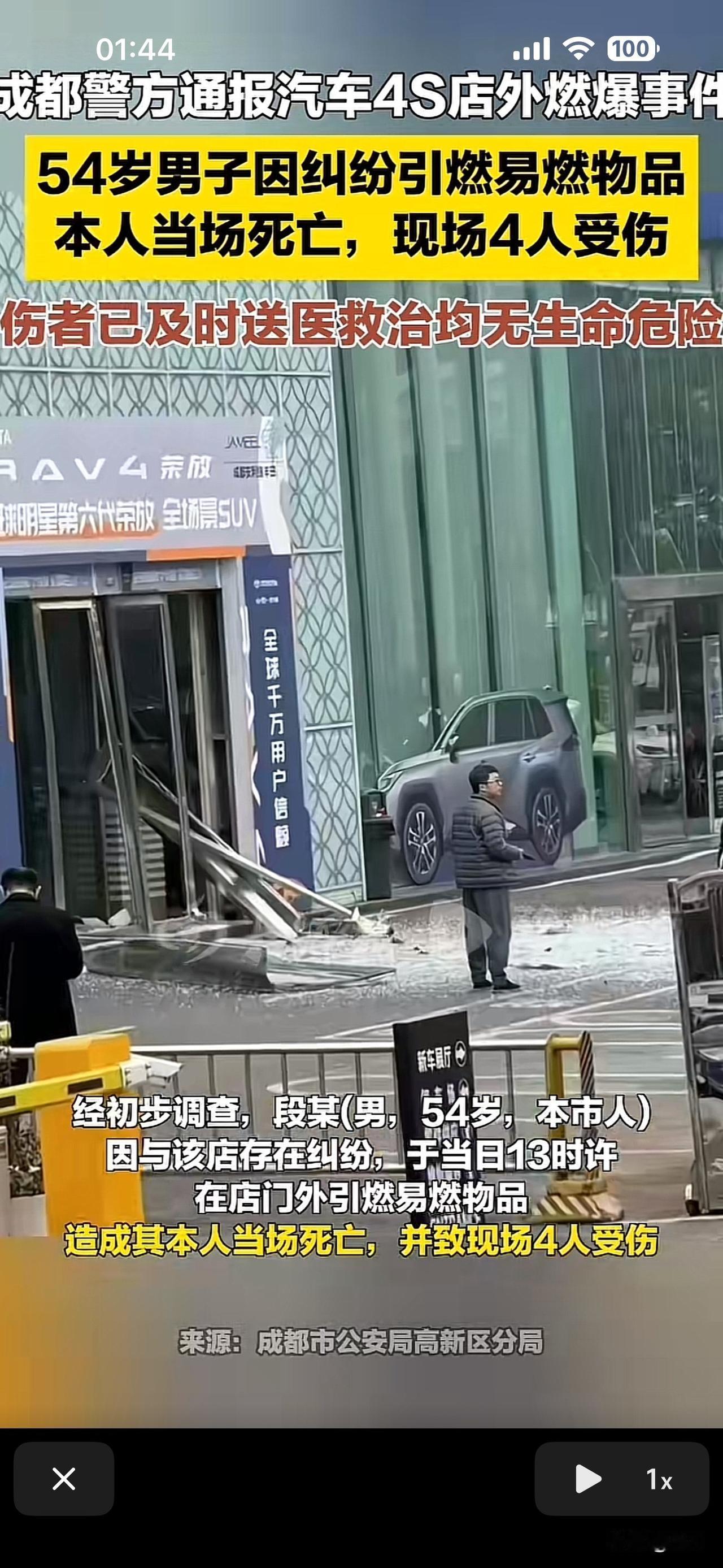 成都警方通报,汽车4s店外燃爆事件 小编发现,近期54岁男子🧍‍♂️因纠纷引燃易燃物品。本人当场死亡,现场4人受伤🤕。伤者已经送到医院治疗,针对此事,大家怎么看?