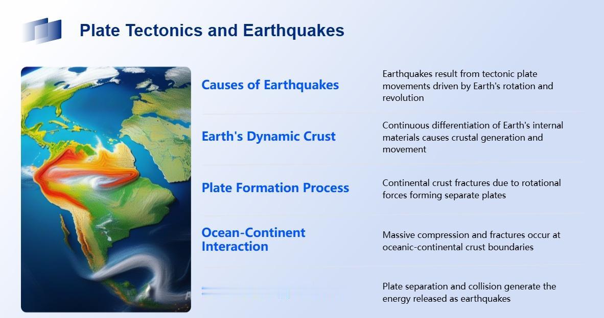 为什么会发生地震? 关于地震的成因是什么,人类至今尚未找到完美的答案。目前科学家比较公认的解释是:地震是由地壳板块运动造成的。 由于地球在无休止地自转和公转,其内部物质也在不停地进行分异,所以围绕在地球表面的地壳不断地生成、演变和运动。 地球表面的陆壳由于受到地球自转和公转的力的作用而发生断裂,开始向两侧慢慢拉张,由一个板块变成两个板块。随着拉张的宽度越来越大,两个板块分离。随着拉张的继续,洋壳和陆壳的接触部位会发生巨大的挤压和断裂现象,这种现象就是所谓的地震。