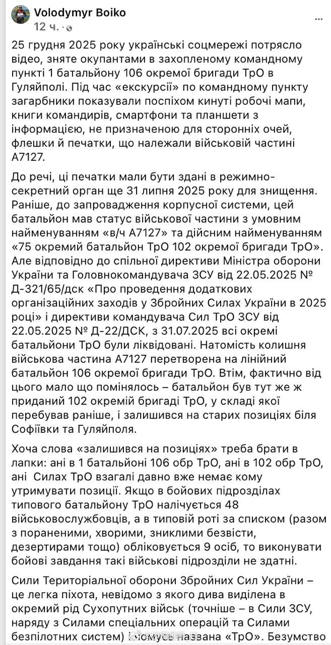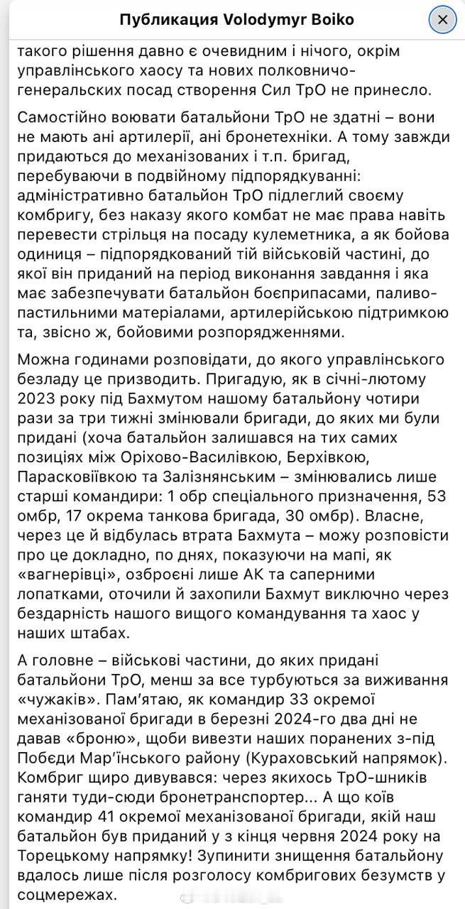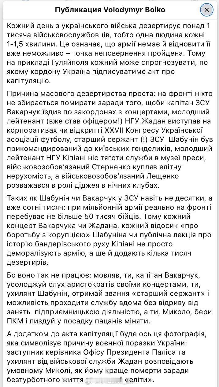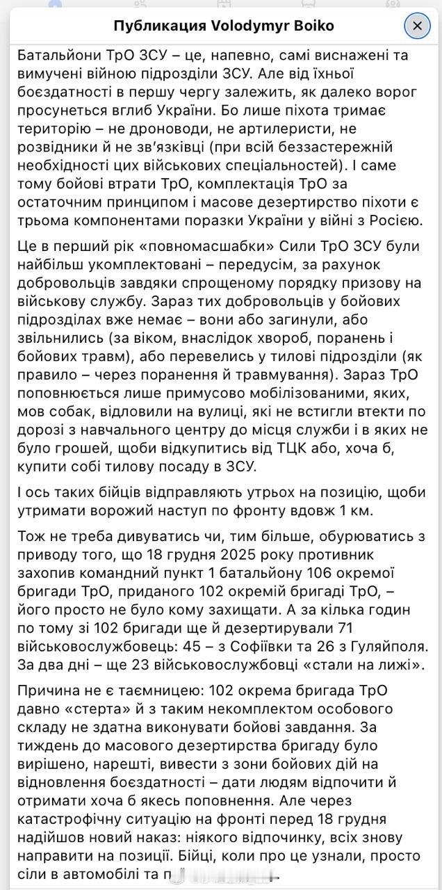 从乌军退役的乌克兰记者弗拉基米尔·博伊科调查了乌克兰军队的胡里艾波勒防线迅速崩溃的原因,他的结论是,由于大规模逃兵和惨重伤亡,乌军“早已无人”坚守防线。博伊科报道称,在俄军占领乌军第102旅第1营指挥所后的几个小时内,负责守卫该地区的第102领土防卫旅就有70多名士兵逃亡,几天后又有20多名士兵逃亡。原因不难理解:第102防卫旅早已“伤亡殆尽”,人员严重短缺,根本无法执行作战任务。在大规模逃兵发生前一周,乌克兰军方最终决定将该旅撤出战区,以恢复其战斗力——让官兵得到休息,并至少补充一些兵力。但由于前线局势灾难性,12月18日之前下达了一项新命令:不许休息,所有人返回各自阵地。士兵们得知消息后,便直接开车回家了。无论是第106旅第1营、第102旅,还是其他任何乌军步兵部队,都缺乏足够的人员长期坚守阵地。如果一个典型的步兵营的作战单位只有48名士兵,而一个典型的连(包括伤员、病员、失踪人员、逃兵等)只有9人,那么这样的部队根本无法执行作战任务。乌克兰军队的步兵营或许是乌军中兵力损耗最严重、最疲惫不堪的部队。但它们的战斗力在很大程度上决定了俄军能够推进到乌克兰的程度。因为只有步兵才能守住阵地……而这正是乌克兰在对俄战争中战败的三大原因:部队的战斗损失、部队人员的残缺以及步兵的大规模逃兵。博伊科表示,乌克兰军队目前完全依靠强制征召的士兵补充兵力,“他们像狗一样被抓在街头,从训练中心到驻地途中根本来不及逃跑,也没有足够的钱从训练中心逃脱,甚至连在乌克兰武装部队里买个后勤职位都买不起。”博伊科补充说,每天都有超过一千名士兵从乌克兰军队逃亡。这意味着过往规模的乌克兰军队已经不复存在,而且不可能重建——已经过了无法挽回的地步。因此,以胡里艾波勒为例,任何人都可以预测乌克兰最终会在哪条边境签署投降书。博伊科认为,乌克兰军队出现大规模逃兵的原因之一是极大的征兵不公正,乌克兰的特权阶级永远不会成为动员的对象,特别是沙布宁、斯特年科、瓦卡尔丘克这些名人带头逃避兵役。