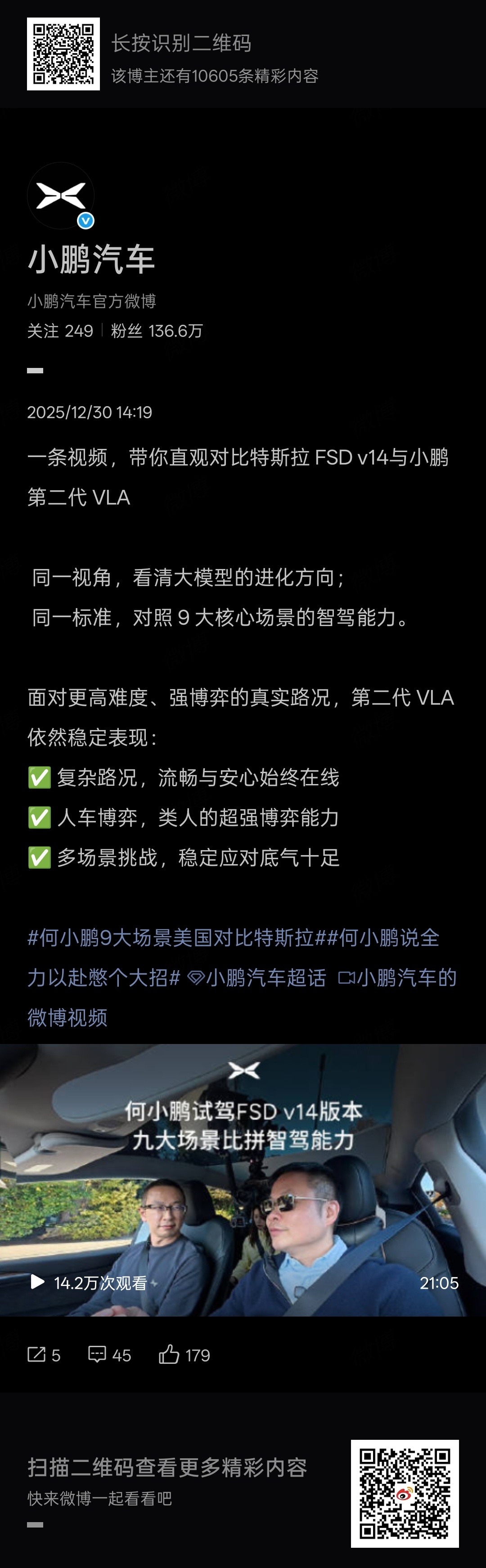 小鹏第二代VLA深度对比特斯拉满血版FSD两个我“最熟悉的陌生智驾系统”,低阶版本都玩过,但最新最强版本现在求而不得的只能看看对比视频,满屏的眼馋但说不定明年一季度,小鹏第二代VLA全量了,特斯拉满血版FSD也入华了会有这么完美么!何小鹏9大场景美国对比特斯拉小鹏和特斯拉将共同加速全球L4进程何小鹏邀请马斯克明年PK