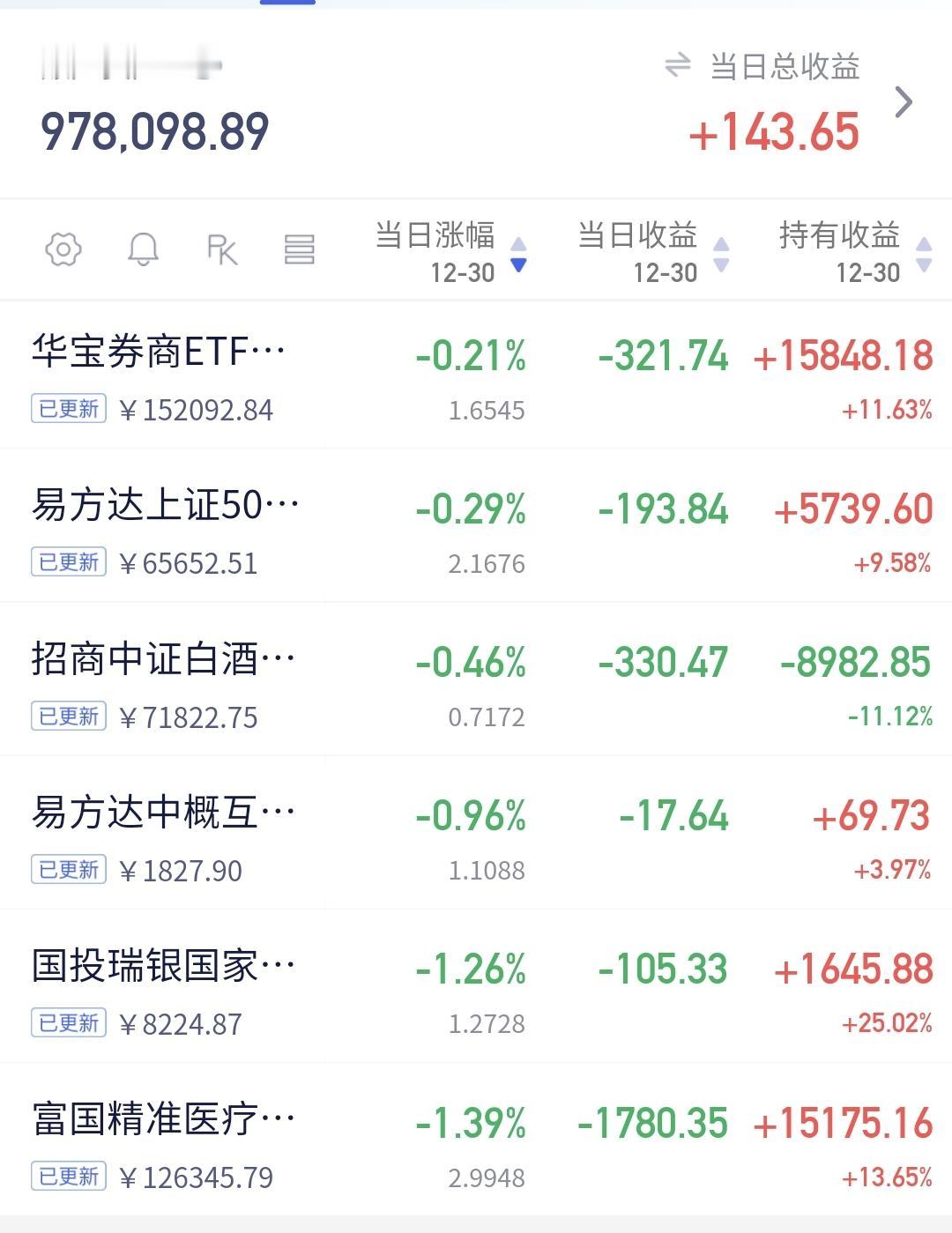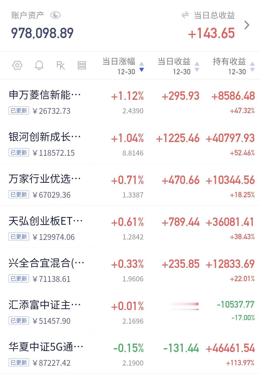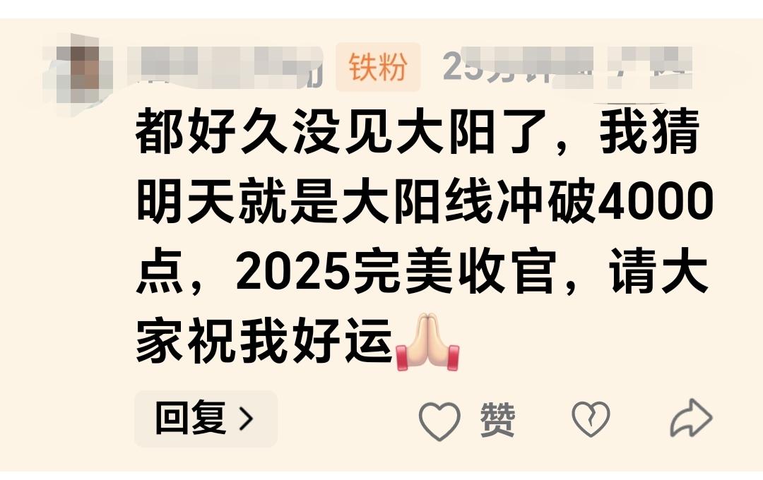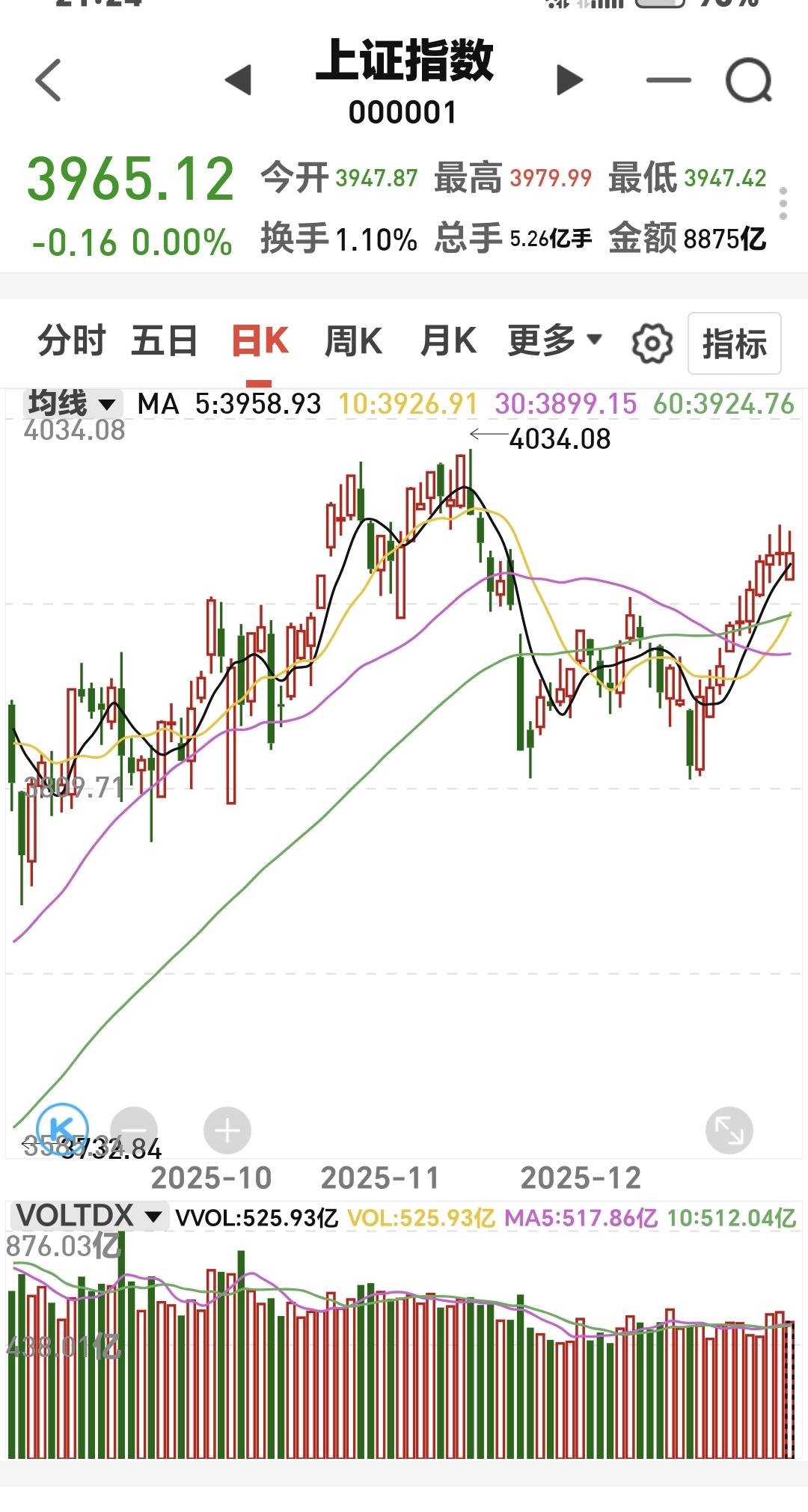 基金:市场好久没见大阳了,今天大阳线冲破4000点,让2025年完美收官。 这是一位朋友的留言,谢谢这位朋友。 市场10连阳,11连阳在向我们招手,今天只要上涨就是11连阳,表明观点,11连阳的概率还是有的。 昨天上证指数是微跌,由于早上是低开,所以,昨天的阳线是一个真阴假阳线,事实上是阴性,但看起来是阳线,这样才有了11连阳。 今天盘中压力还是3992点,盘中支撑还是3950点,只要能够保持在3950点之上,对盘面的后期走势就不要过分担心,只要能够突破并站稳3992点,节后再创4034点新高,就是大概率事情。 对于今天能不能够站上4000点,能不能够站在4000点上方跨年,我认为可能性很小,几乎是不可能的事情,可以看一下下面的截图2,这是上证指数日K线图,看一下最近3个交易日的K线,都是带有长上影线的K线,这说明上面的压力是很重的,说明越往上走压力越重,摸一下4000点的可能性都不大,不要说站在4000点上方跨年了。 2025年剩下今天最后一个交易日了,9月份以后,我的主要任务就是保住利润, 保住总资产在180万之上跨年,现在看,这个任务是完成了,今天的盘面谨防冲高回落,场内的人,在冲高的时候,可以找机会落袋为安,昨天我已经提前把场内的大幅度落袋了,手中拽着资金,2026年再战。 对于手上的资金,最理想的进场点是哀鸿遍野,最舒服的进场点是无人问津,不要着急,人声鼎沸的时候,进场被套的概率是80%,哀鸿遍野的时候,进场挣钱的概率是80%,每年都有哀鸿遍野的时候,每年都有人声鼎沸的时候,哀鸿遍野的时候,最怕的就是你只有筹码没有资金,人声鼎沸的时候,最怕的就是你只有资金没有筹码。悲鸿遍野的时候,需要你把资金变成筹码,人声鼎沸的时候,需要你把筹码变成资金,我们现在是半仓,如果先见到人声鼎沸,我们可以把半仓的筹码变成现金,如果先见到哀鸿遍野,我们可以把半仓的现金变成筹码,这些都是2026年上半年需要做的事情。 我每天都会分享我的观点,我的观点只代表我个人的看法,不能作为你操作的依据,据此操作后果自负。