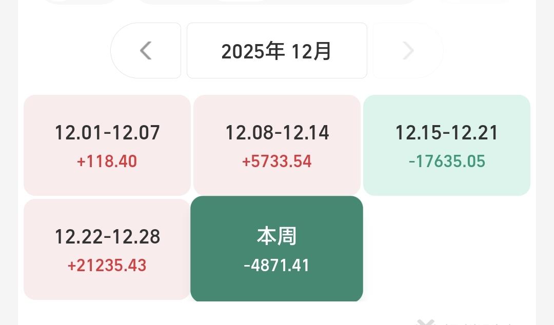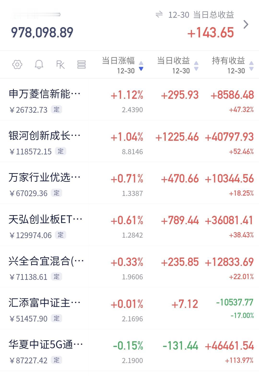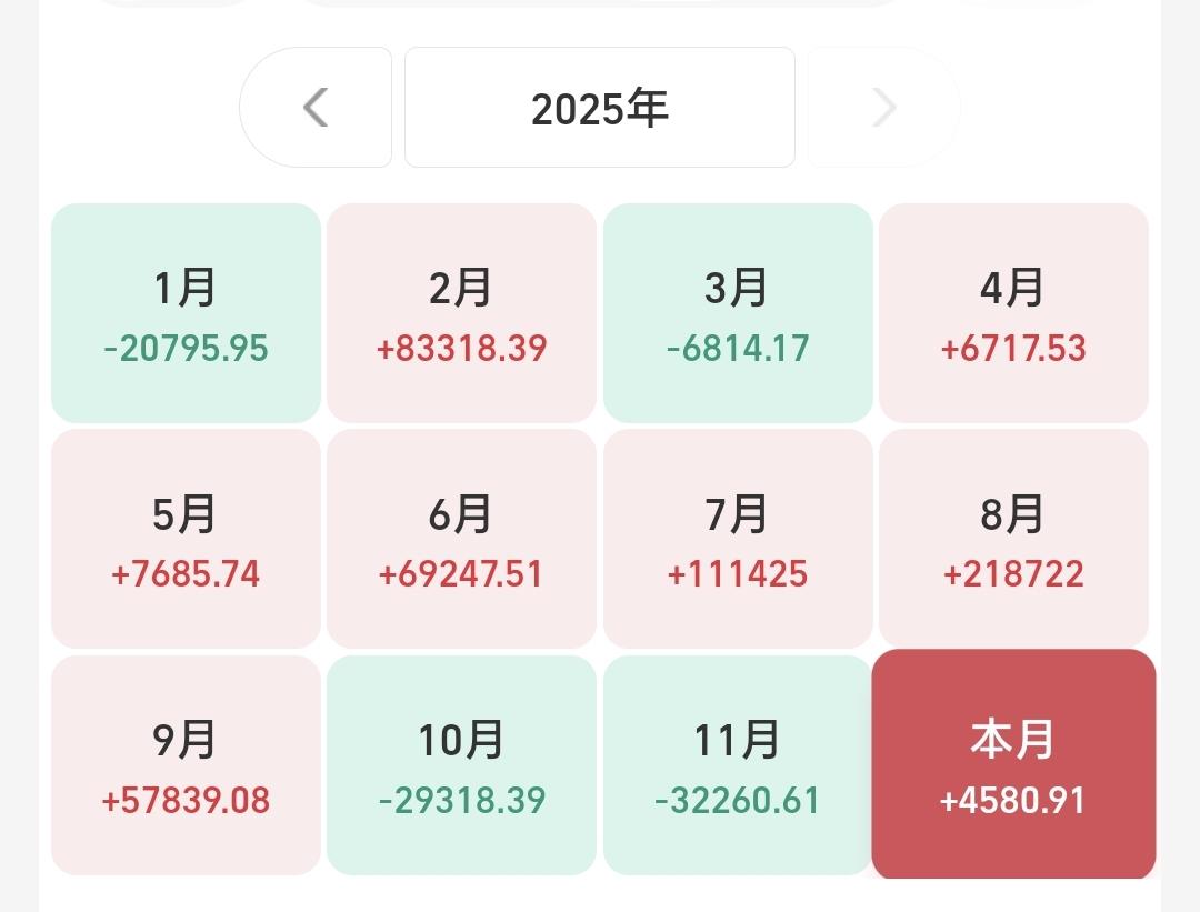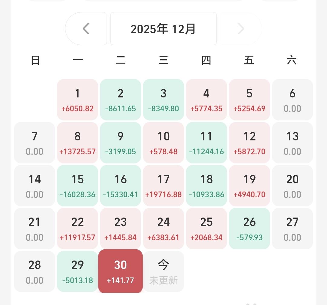 基金:现在的潜伏,就是为了将来的上涨 昨天基金收益141元,基金持有978583元,现金持有883127元,资产总额1861711元,今天的亏损金额只要在60000块钱以下,就能保持总资产在180万以上跨年,就能完成年初制定的目标,就能顺利向2026年230万的目标进行冲击,要达到这个目标,必须要上涨30%以上,难度还是很大的。 本周有了2个交易日,1盈1亏,1个交易日盈利,1个交易日亏损,周亏损4871元。 本月有了22个交易日,9亏13赢,9个交易日亏损,13个交易日盈利,月收益4580元,今天只要亏损金额小于4580元,12月份就是盈利的。 今年以来收益470347元,收益率36.50%,跑赢了全国95.39%的基民,也跑赢了沪深300指数18.21%的上涨幅度。 近一年以来收益436908元,收益率33.05%,跑赢了沪深300指数16.31%的上涨幅度。 持有的基金中,昨天晚上净值更新以后,上涨幅度最大的三个板块是:新能源汽车板块,芯片半导体板块,大科技混合,下跌幅度最大的三个板块是:医疗板块,军工板块,白酒板块。 欧洲市场昨天晚上上涨,英国上涨了0.75%,法国上涨了0.69%,德国上涨了0.57%,上涨幅度都不大。 美股市场昨天晚上下跌,标普指数下跌了0.14%,道琼斯指数下跌了0.20%,纳斯达克指数下跌了0.24%,下跌幅度也都不大。 今天是2025年的最后一个交易日,今天的盈亏对全年的收益影响不大,2025年格局已定,是一个慢牛走势,2026年情况未知,还存在许多不确定性,我们现在要做的就是把2026年的期望值降低,说话说,天无百日晴,花无千日红,越是市场喧闹的情况之下,越是要谨慎,越是市场低迷的情况之下,越是要大胆,对于板块也是这样的,套人的都是那些热门板块,机会都存在于那些长期低位的板块。 有人说,持有的基金长期下跌,为什么不把它卖掉,你想一想,去年924之前,我们持有的基金绝大部分都是亏损的,绝大部分都是长期下跌的,如果那个时候把持有的这些亏损基金卖掉,2025年会是一个什么样的局面,那就是看着别人娶媳妇儿,空欢喜,看着指数上涨千点,跟你一点关系都没有。 现在的潜伏,就是为了将来的上涨,现在的追高,就是为了将来的被套,玩基金就是要眼光长远一点,玩基金就是要格局大一点。 我每天都会分享我的观点,我的观点只代表我个人的看法,不能作为你操作的依据,据此操作后果自负。