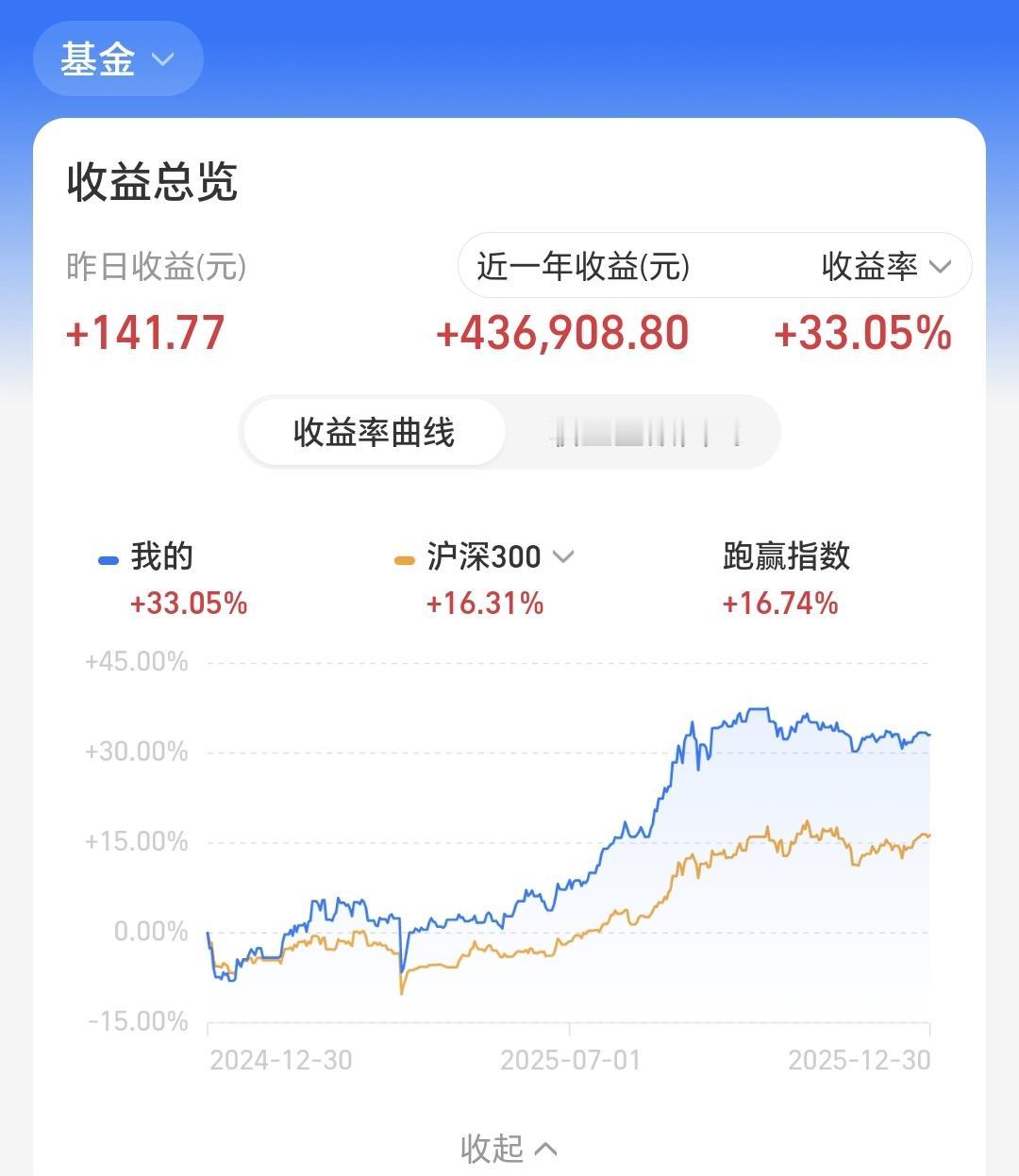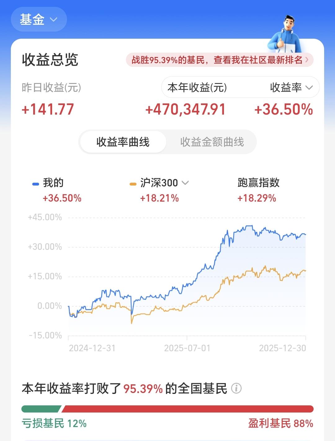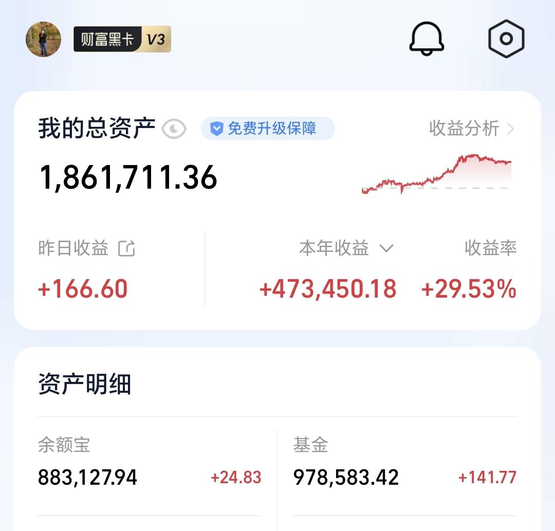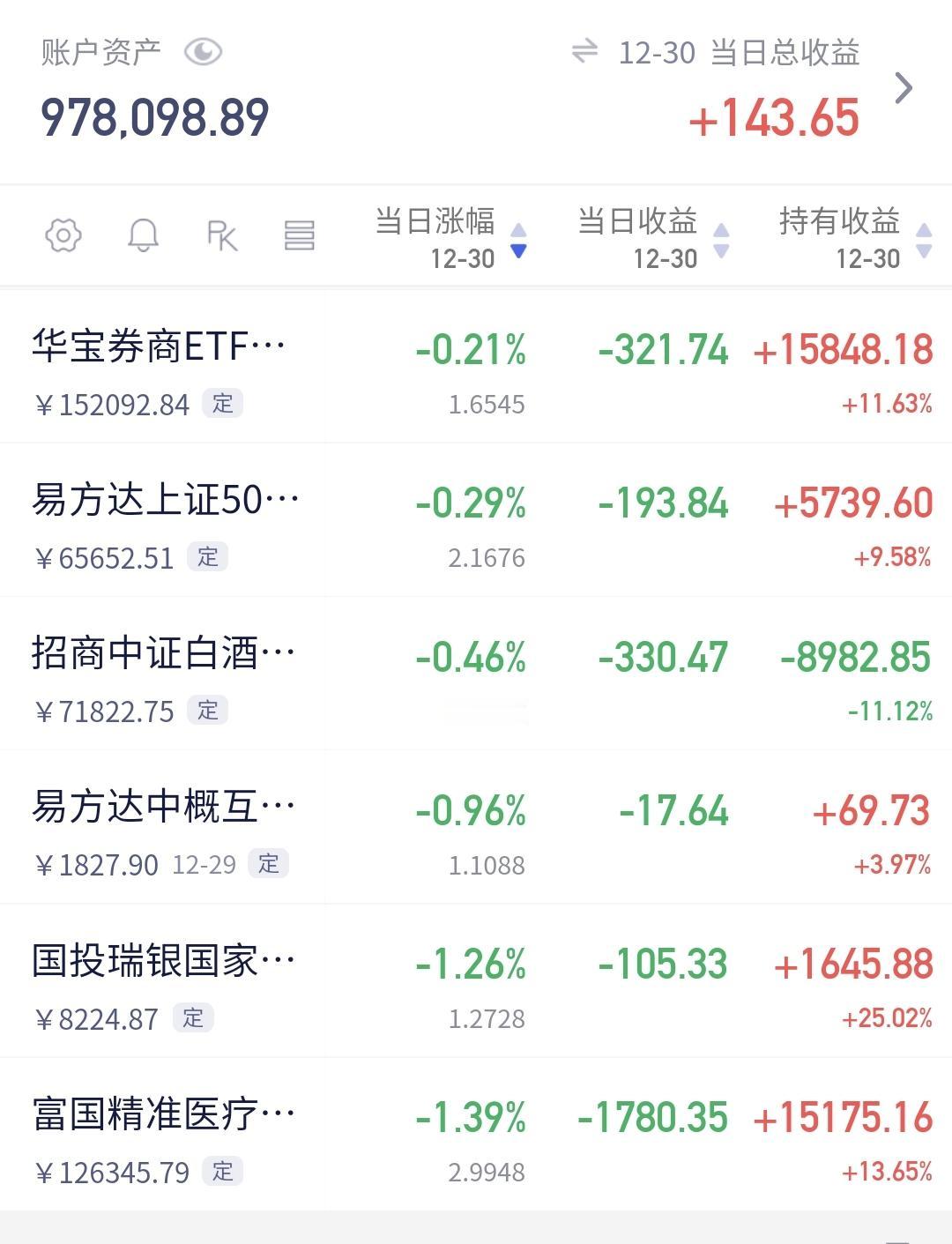 基金:现在的潜伏,就是为了将来的上涨 昨天基金收益141元,基金持有978583元,现金持有883127元,资产总额1861711元,今天的亏损金额只要在60000块钱以下,就能保持总资产在180万以上跨年,就能完成年初制定的目标,就能顺利向2026年230万的目标进行冲击,要达到这个目标,必须要上涨30%以上,难度还是很大的。 本周有了2个交易日,1盈1亏,1个交易日盈利,1个交易日亏损,周亏损4871元。 本月有了22个交易日,9亏13赢,9个交易日亏损,13个交易日盈利,月收益4580元,今天只要亏损金额小于4580元,12月份就是盈利的。 今年以来收益470347元,收益率36.50%,跑赢了全国95.39%的基民,也跑赢了沪深300指数18.21%的上涨幅度。 近一年以来收益436908元,收益率33.05%,跑赢了沪深300指数16.31%的上涨幅度。 持有的基金中,昨天晚上净值更新以后,上涨幅度最大的三个板块是:新能源汽车板块,芯片半导体板块,大科技混合,下跌幅度最大的三个板块是:医疗板块,军工板块,白酒板块。 欧洲市场昨天晚上上涨,英国上涨了0.75%,法国上涨了0.69%,德国上涨了0.57%,上涨幅度都不大。 美股市场昨天晚上下跌,标普指数下跌了0.14%,道琼斯指数下跌了0.20%,纳斯达克指数下跌了0.24%,下跌幅度也都不大。 今天是2025年的最后一个交易日,今天的盈亏对全年的收益影响不大,2025年格局已定,是一个慢牛走势,2026年情况未知,还存在许多不确定性,我们现在要做的就是把2026年的期望值降低,说话说,天无百日晴,花无千日红,越是市场喧闹的情况之下,越是要谨慎,越是市场低迷的情况之下,越是要大胆,对于板块也是这样的,套人的都是那些热门板块,机会都存在于那些长期低位的板块。 有人说,持有的基金长期下跌,为什么不把它卖掉,你想一想,去年924之前,我们持有的基金绝大部分都是亏损的,绝大部分都是长期下跌的,如果那个时候把持有的这些亏损基金卖掉,2025年会是一个什么样的局面,那就是看着别人娶媳妇儿,空欢喜,看着指数上涨千点,跟你一点关系都没有。 现在的潜伏,就是为了将来的上涨,现在的追高,就是为了将来的被套,玩基金就是要眼光长远一点,玩基金就是要格局大一点。 我每天都会分享我的观点,我的观点只代表我个人的看法,不能作为你操作的依据,据此操作后果自负。