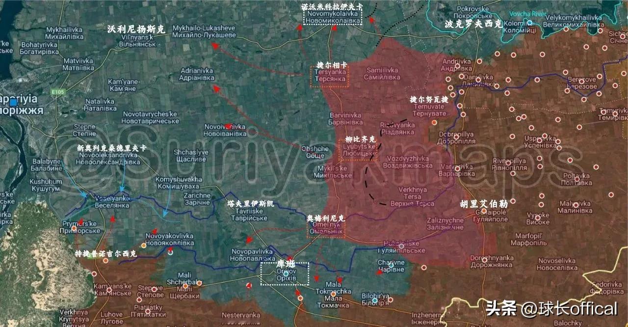应该不会直接这样整体推进。冬季俄军估计就能从捷尔努瓦捷方向突破上捷尔萨河,抵达柳比齐克和奥梅利尼克一带。此时58集和vdv也大概率完成了进攻奥列霍夫的西翼阵地,从西北方向逼近奥列霍夫。然后大概三四月份,估计就会有对新尼古拉耶夫卡和奥列霍夫的进攻,捷尔相卡倒是很可能确实春季才能打下来。如果一切顺利,到夏季开始,俄军就能越过孔卡河,并在东部抵达沃利尼扬斯克一带,从而在明年下半年展开扎波罗热战役。