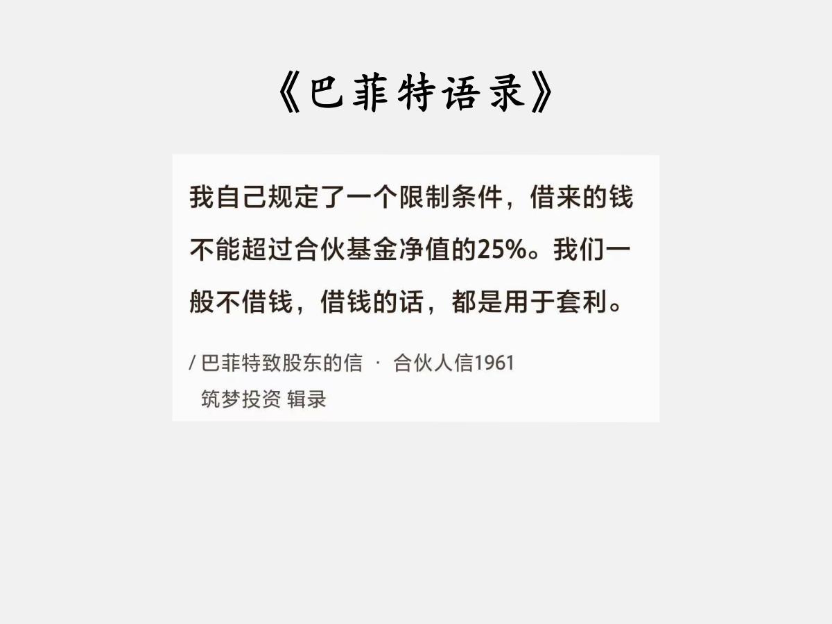 No.046 巴菲特谈“杠杆比例” 巴菲特曰:“我自己规定了一个限制条件,借来的钱不能超过合伙基金净值的25%。我们一般不借钱,借钱的话,都是用于套利。” 借钱投资不是不可以,只是有资格上杠杆的投资者少之又少,能用好的就更少了。毕竟,中国A股是一个九成以上股民都没有赚到钱的修罗场。 在借钱投资时,杠杆比例控制在多少合适呢?巴菲特控制在25%,即100万本金顶多借25万做投资,且做的是安全度很高的套利投资。 投资者最好不要上杠杆。如果要上,最好控制在本金的30%以内,甚至是更安全的20%,可以有较大的转圜余地,让投资者进退自如。 如果比例上升到50%,那就很危险。当市场暴跌,出现腰斩时,本金将会大幅缩水。百万本金,50万融资,跌个50%,本金就只剩25万了。 债务不会随着股市下跌而减少或消失。当市场下跌,承担亏损的是投资者的本金,而不是债务。 股市是个患有躁郁症的疯子,毫无理性可言。任何情况都可能发生。做投资,安全第一,不败而后求胜。