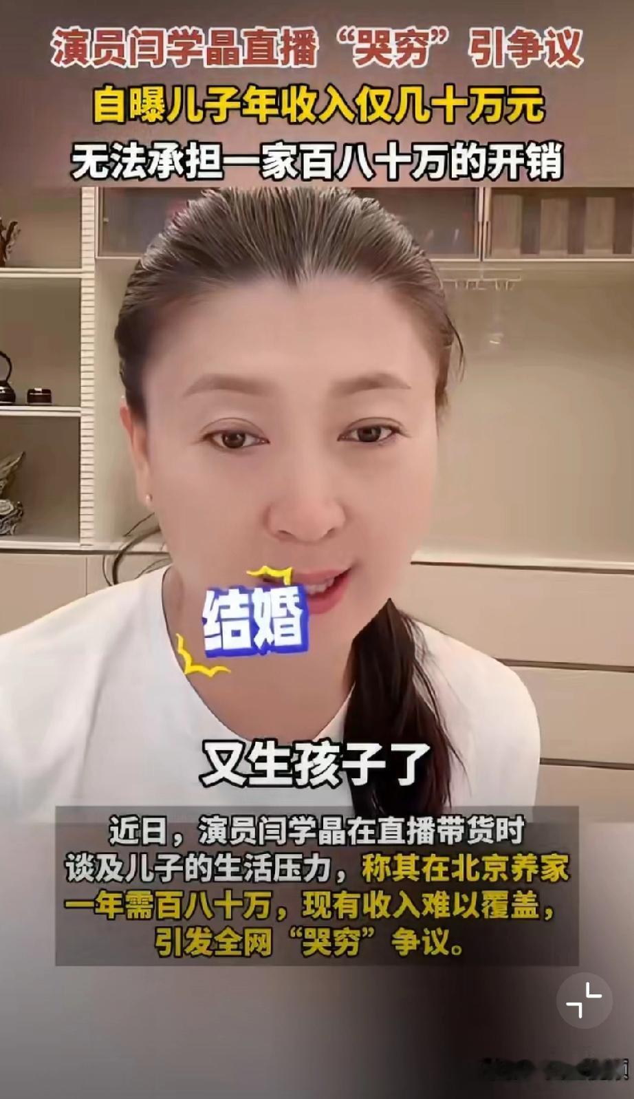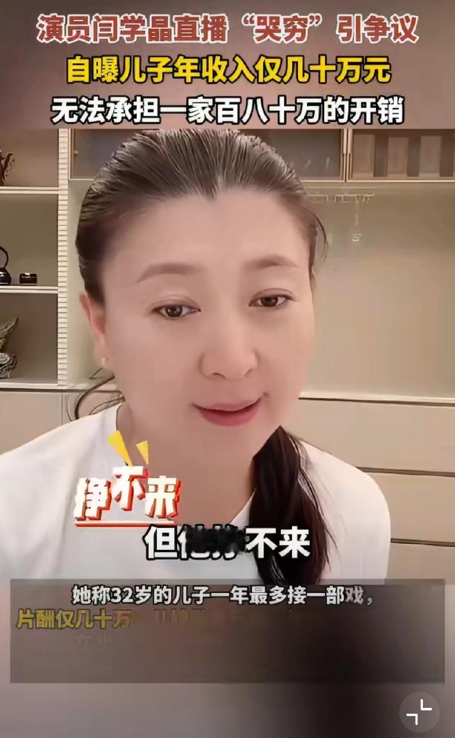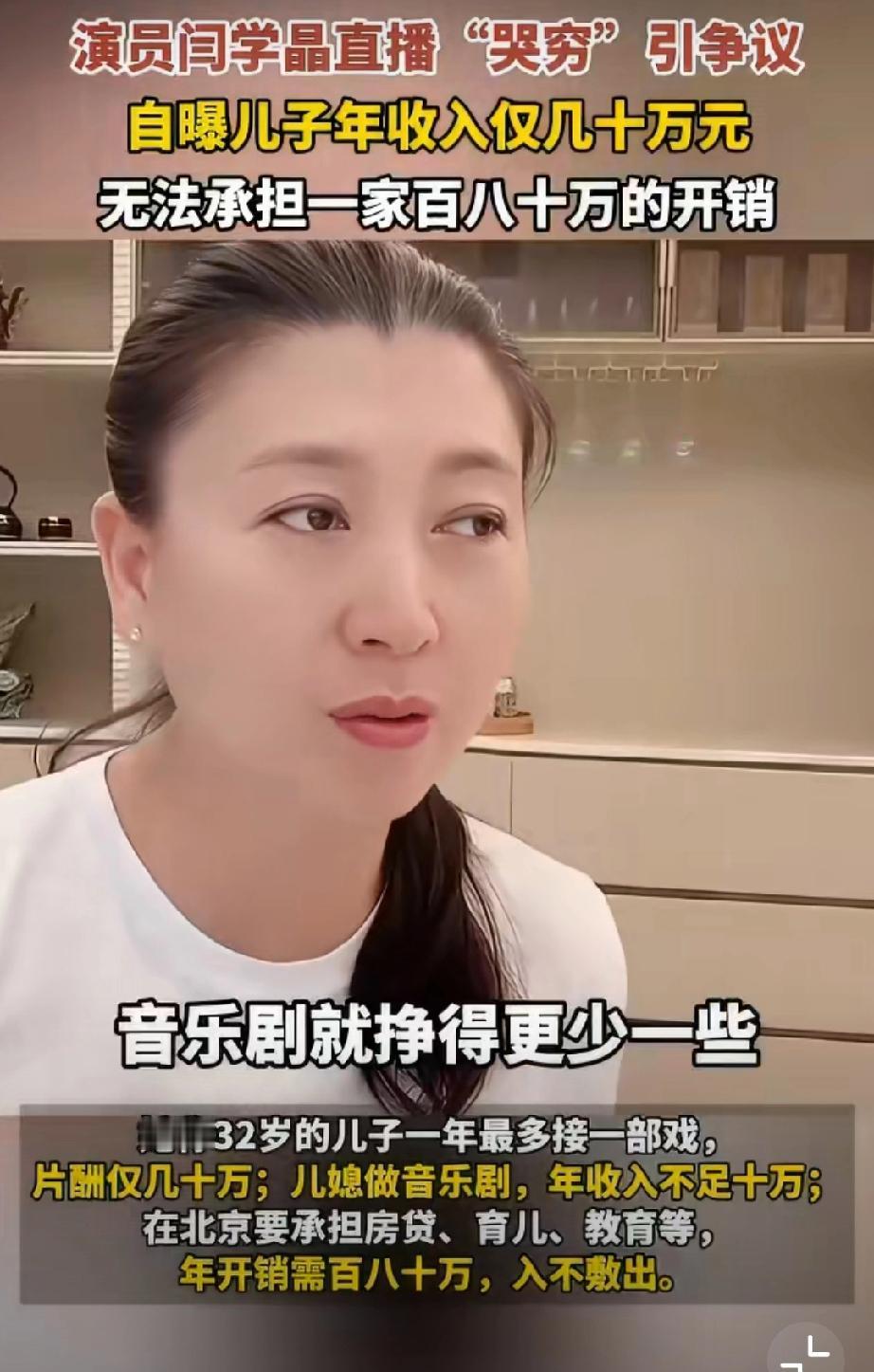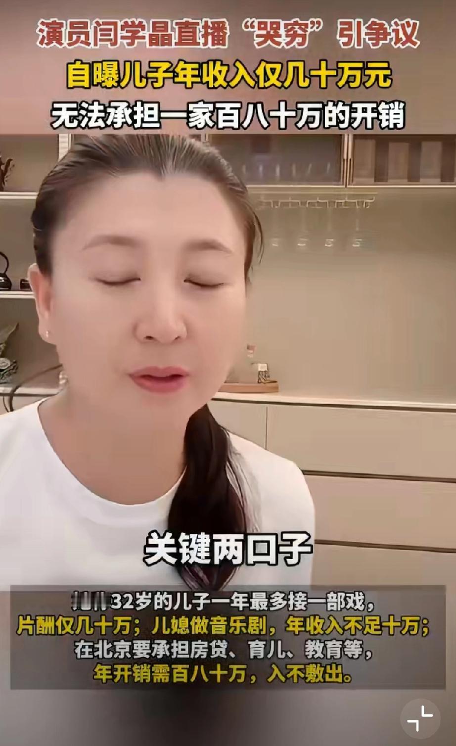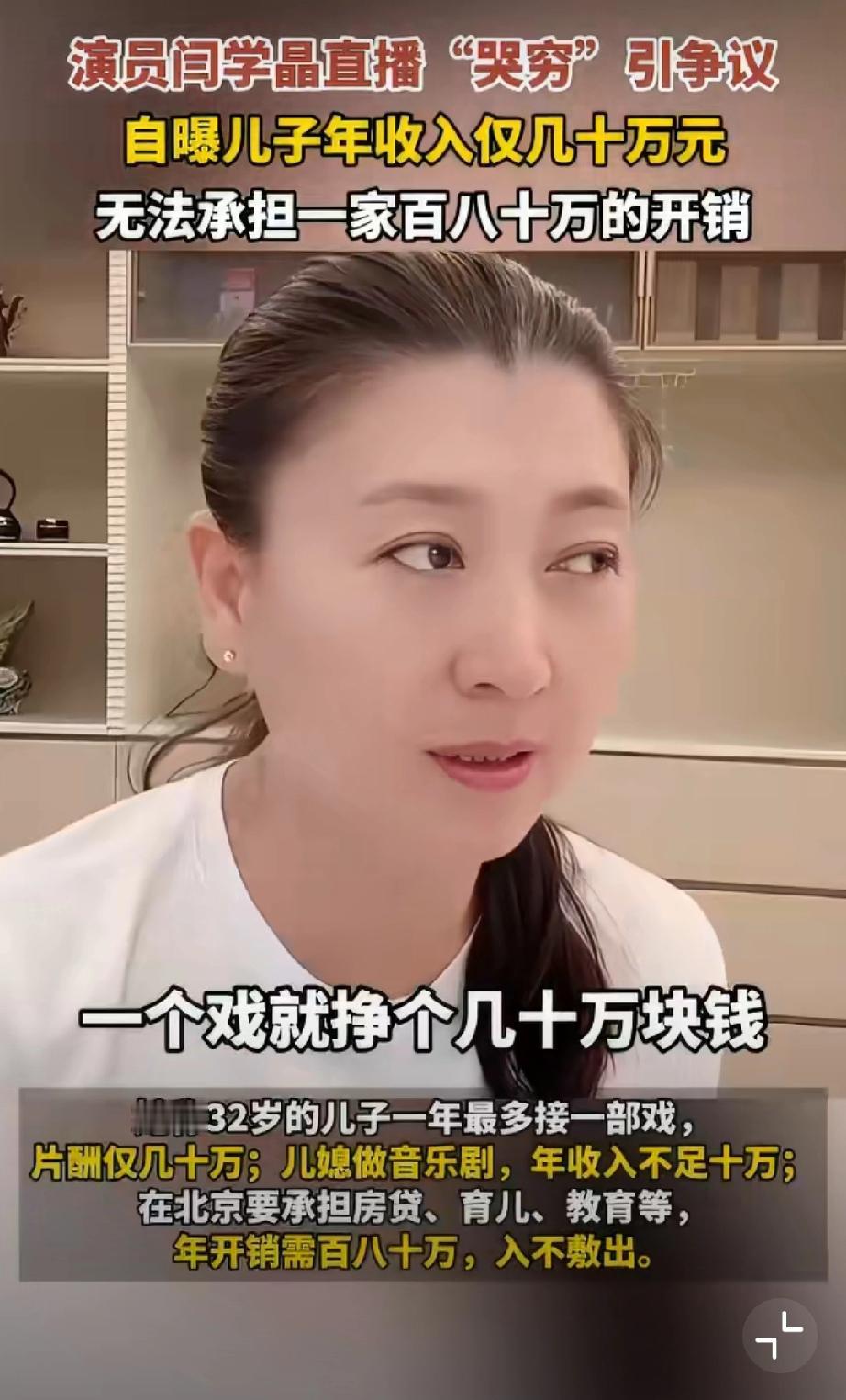 演员闫学晶哭穷引争议。 一级演员闫学晶直播哭穷,32岁的儿子年收入“仅几十万元”,却需负担家庭年开支百八十万! 她名下几套房,北京一套100多平大平层,三亚两套海景房,房贷也还清了…… 算下来,至少也是几千万的家底了! 普通人来说,一部剧能挣几十万,难以想象的多了! 不过,站她角度说的是实话,他们那个圈层,一年搞个几百万稀松平常,一年收入百八十万确实算穷……[允悲] 只能说,他们理解的穷,根本不是普通人说的穷! 演了一辈子穷人,确实不知道穷人是怎么活的了……跨界女王闫学晶 闫学晶演唱会 闫学晶唱评剧
