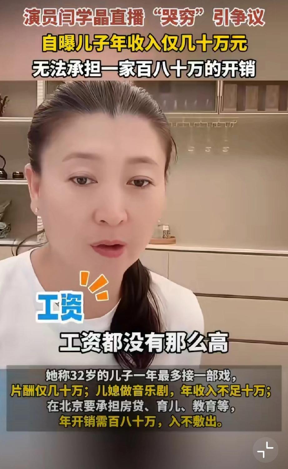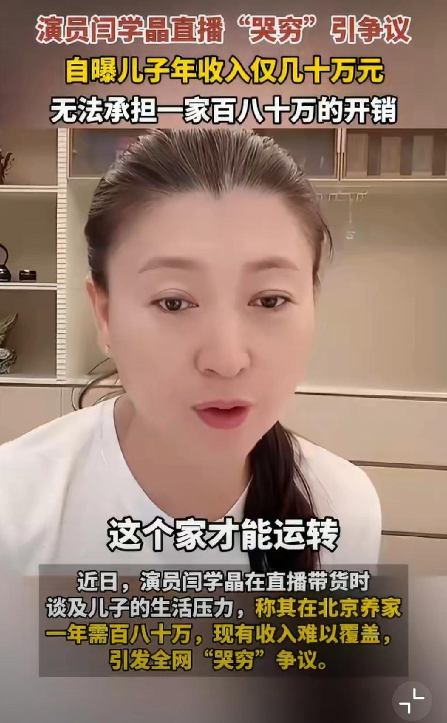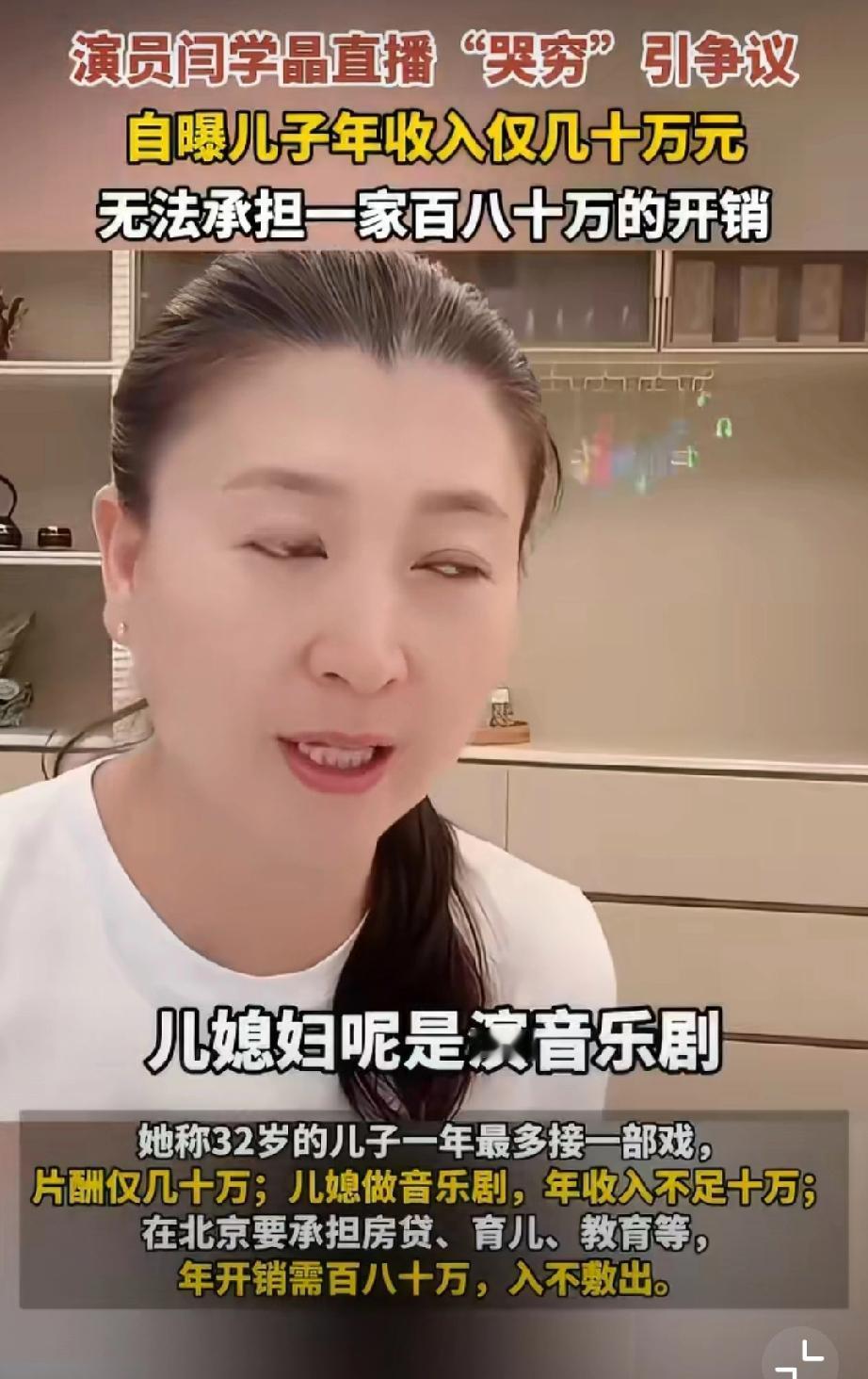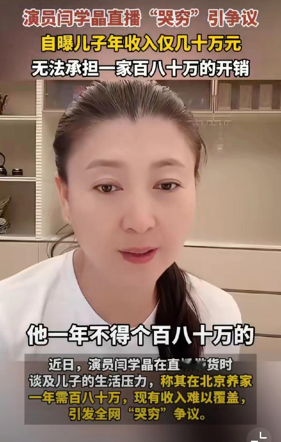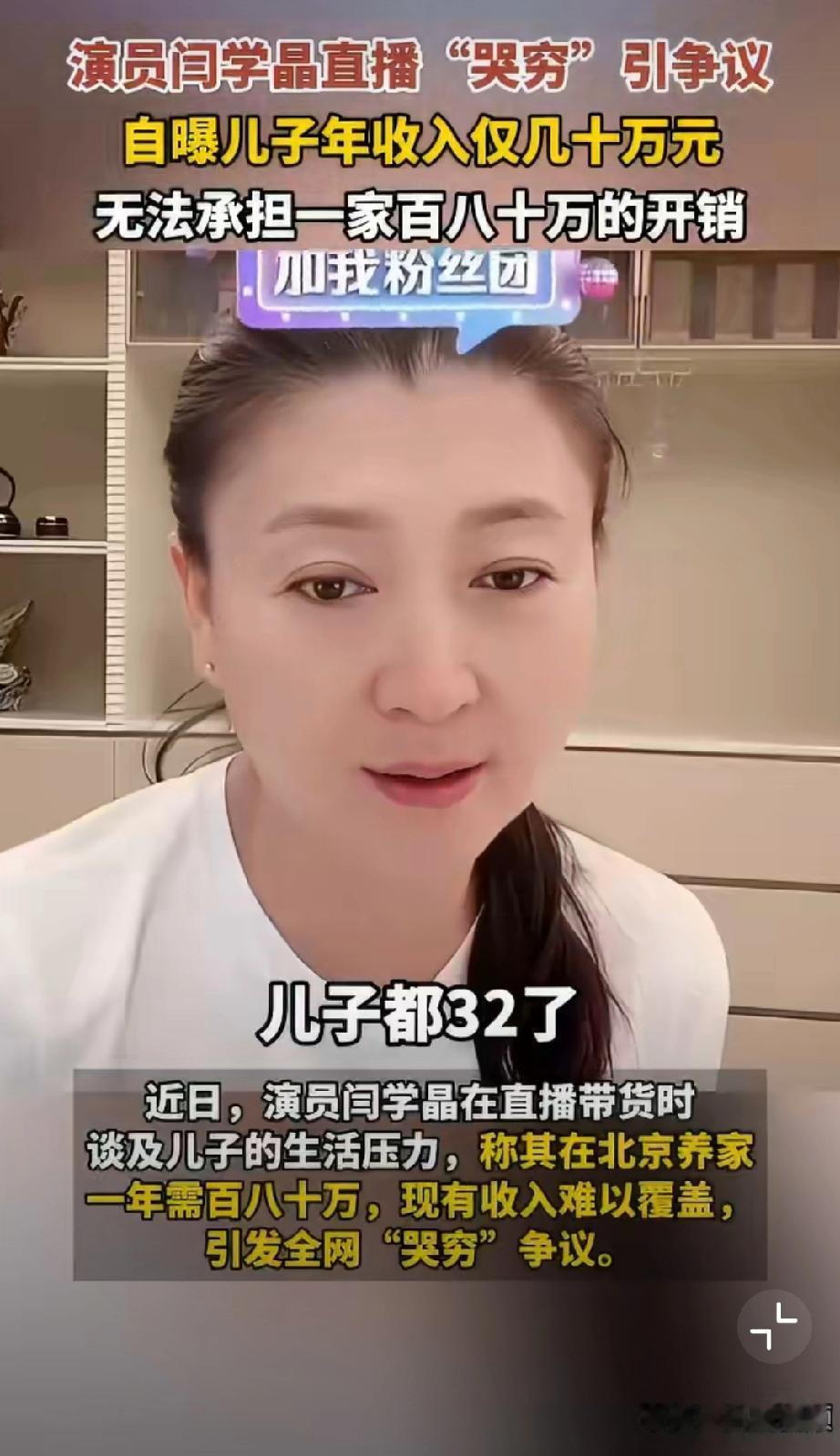 演员闫学晶哭穷引争议。 一级演员闫学晶直播哭穷,32岁的儿子年收入“仅几十万元”,却需负担家庭年开支百八十万! 她名下几套房,北京一套100多平大平层,三亚两套海景房,房贷也还清了…… 算下来,至少也是几千万的家底了! 普通人来说,一部剧能挣几十万,难以想象的多了! 不过,站她角度说的是实话,他们那个圈层,一年搞个几百万稀松平常,一年收入百八十万确实算穷……[允悲] 只能说,他们理解的穷,根本不是普通人说的穷! 演了一辈子穷人,确实不知道穷人是怎么活的了……跨界女王闫学晶 闫学晶演唱会 闫学晶唱评剧