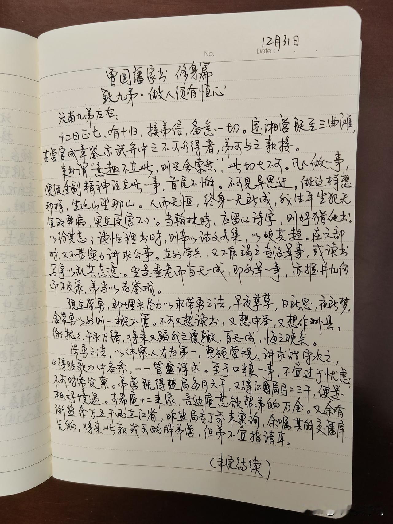 家庭共读并抄书第18天:《曾国藩家书》修身篇 致九弟.做人需有恒心 人贵有恒,在这篇对九弟曾国荃的信中,曾国藩用自己的经历,比如在翰林而列他书、读理书杂以诗文、带兵时读书乱其志,并用“掘井九仞而不及泉”比喻自己的错误。并力劝九弟勿蹈自己的覆辙,教育他做事要首位不懈,不可见异思迁。 我们做事何尝不是这样呢!只要我们能凝心聚力,认真做好每一件事,那么什么事都能成功!
