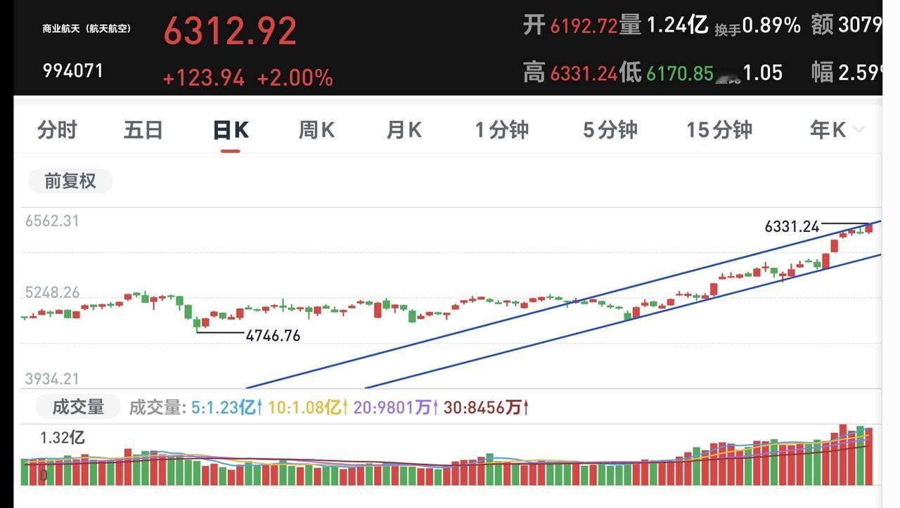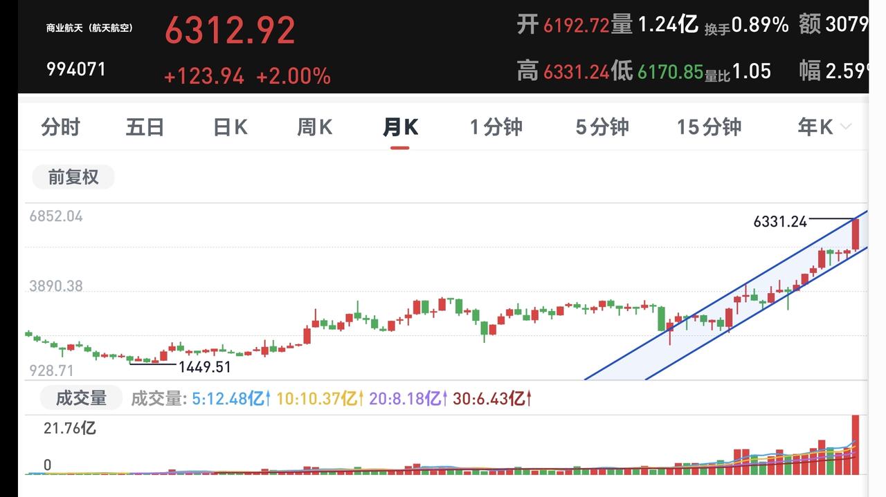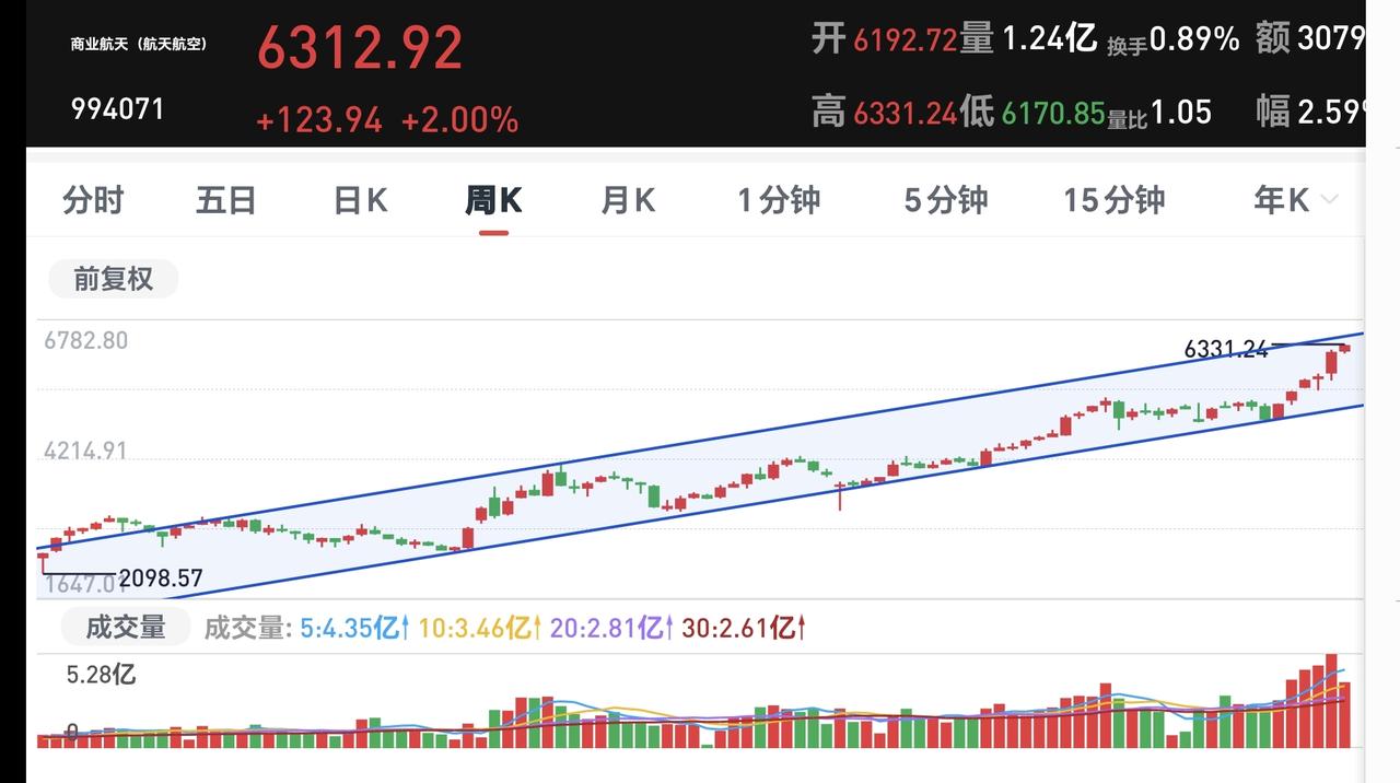基金:商业航天板块的进场点 商业航天板块是2025年的主线板块之一,这个板块全年上涨了76.34%,见下面的截图1,基本上是在全年的最高点附近收盘。 我们来看一下下面的截图2,这是商业航天板块日K线图,从图中可以看出,这个板块日线级别处于上涨趋势中,但现在的位置处于上涨通道上轨附近,这样的情况之下,可以持有,但不可以追涨。 我们来看一下下面的截图3,这是商业航天板块周K线图,从图中可以看出,这个板块现在处于周线级别上涨趋势中,但现在的位置处于上涨通道上轨附近,这样的情况下,也是可以持有,不可以追涨。 我们来看一下下面的截图4,这是商业航天板块月K线图,从图中可以看出,这个板块月线级别处于上涨趋势中,但现在的位置还是处于上涨通道的上轨附近,这样的情况下,还是可以持有,不可以追涨。 有人看到不可以追涨,就认为会下跌,事实上,并不是这样的,不可以追涨的意思是,最好的进场时间节点已经过去,现在的时间节点进场性价比已经不高,上涨通道的下轨附近进场,比上涨通道上轨附近进场,性价比要高很多,上涨通道上轨附近,大概率是震荡调整,上涨通道下轨附近,大概率是震荡反弹。 商业航天板块按照日线级别,周线级别和月线级别看,现在都是可以继续持有,但都不是很好的进场点。 不是很好的进场点,并不代表它不会继续上涨,好的进场点进场了以后,并不代表它一定会上涨,这一段话有很多人应该会看不懂。 我每天都会分享我的观点,我的观点只代表我个人的看法,不能作为你操作的依据,据此操作后果自负。