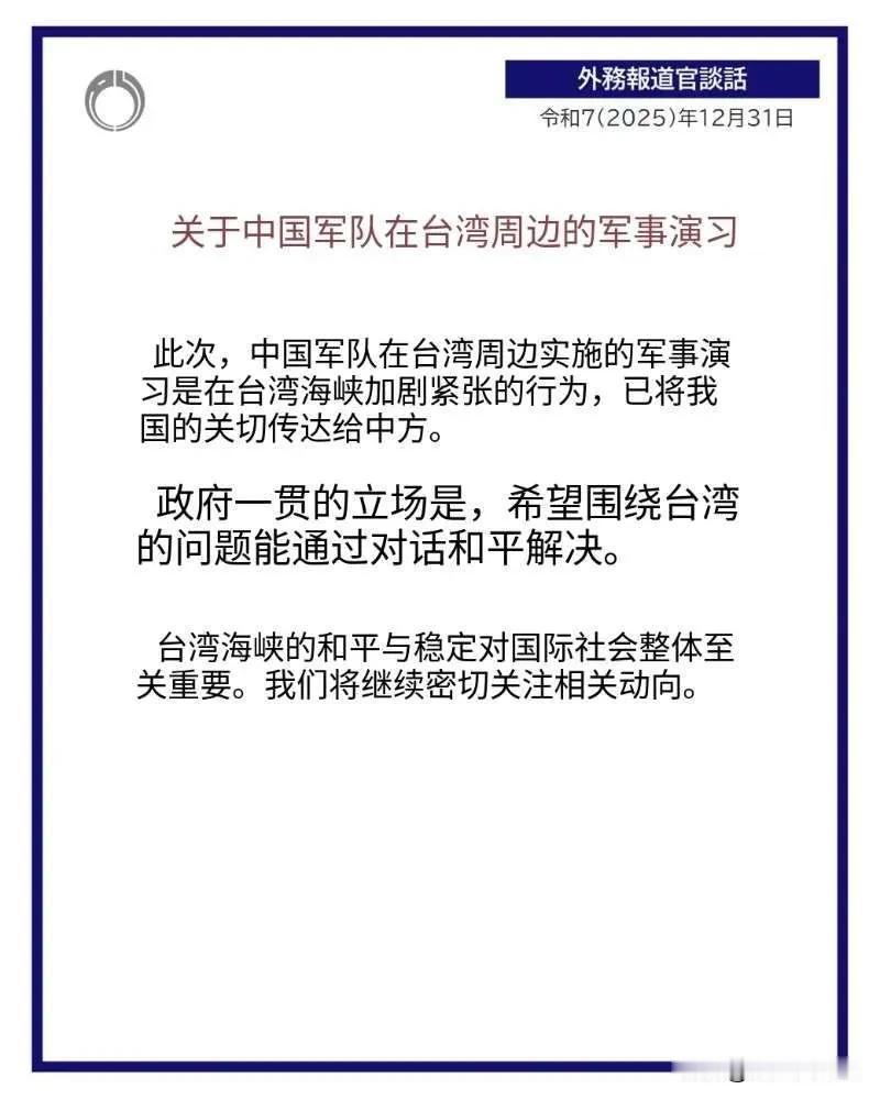 日本外务省憋了三天后,今天(12月31日)发布了一份外务发言人谈话。内容如下:“此次,中国军队在台湾周边实施的军事演习是在台湾海峡加剧紧张的行为,已将我国的关切传达给中方。(日本)政府一贯的立场是,希望围绕台湾的问题能通过对话和平解决。台湾海峡的和平与稳定对国际社会整体至关重要。我们将继续密切关注相关动向。” 评几句 日本外务省这份“姗姗来迟”的声明,与其说是“关切”,不如说是“补票”——补的是高市早苗内阁此前“台湾有事即日本有事”狂言的票,补的是美日联合声明染指台海后必须递上的投名状。表面轻拿“和平对话”,暗地重划“干预红线”,把殖民旧债包装成“国际关切”,将军事挑衅粉饰为“稳定诉求”,典型的历史罪人扮和平使者:当年割台是“东亚共荣”,如今阻挠统一又叫“全球安危”,台词换了,帝国心未死。中国军队在自家门口演习,轮不到曾把台湾当殖民地、至今未就侵略史向中国人民正式赔罪的国家说三道四;真要对话,日本先同自己历史罪行对话,同亚洲受害人民对话,再谈所谓“台海和平”。否则,每一次“关切”都在提醒国人:殖民阴魂未远,对日警惕不能随跨年钟声而放松。