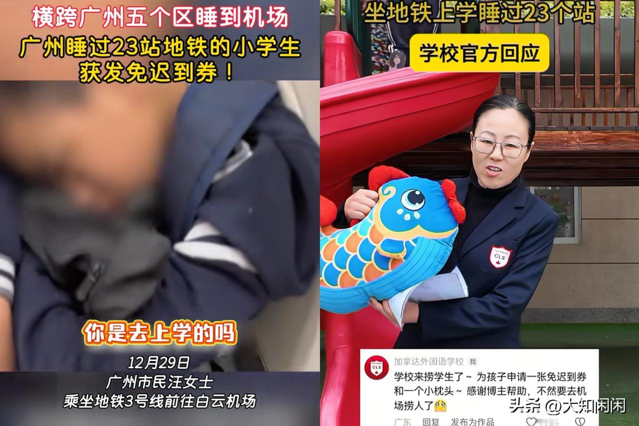 广州熟睡哥睡了23站,本来去上学 睡了23站,整整迟到75分钟 学校来捞人才知道,学校居然是 总学费超100万的贵族学校。 这事儿被博主拍视频发网上火了,视频里学生无奈直叹“睡得太沉,一下就过站了”。学校刷到视频,马上认领,还派老师去机场接人,还幽默地说“多亏博主,不然去机场捞人怪尴尬”,解释这是孩子首次独自出行,不懂安排行程。老师不仅没怪他迟到,还贴心申请“免迟到券”,送助眠小枕头。 网友纷纷点赞:“这钱花得真值,教育就该这样暖人!”贵族学校贵在哪?不只是硬件,更是这种尊重与包容。 没揪着迟到批评,而是用温柔化解尴尬,保护孩子自尊,传递善意。你说,这学校处理得是不是超贴心?要是你当老师,碰上这事儿会咋做?
