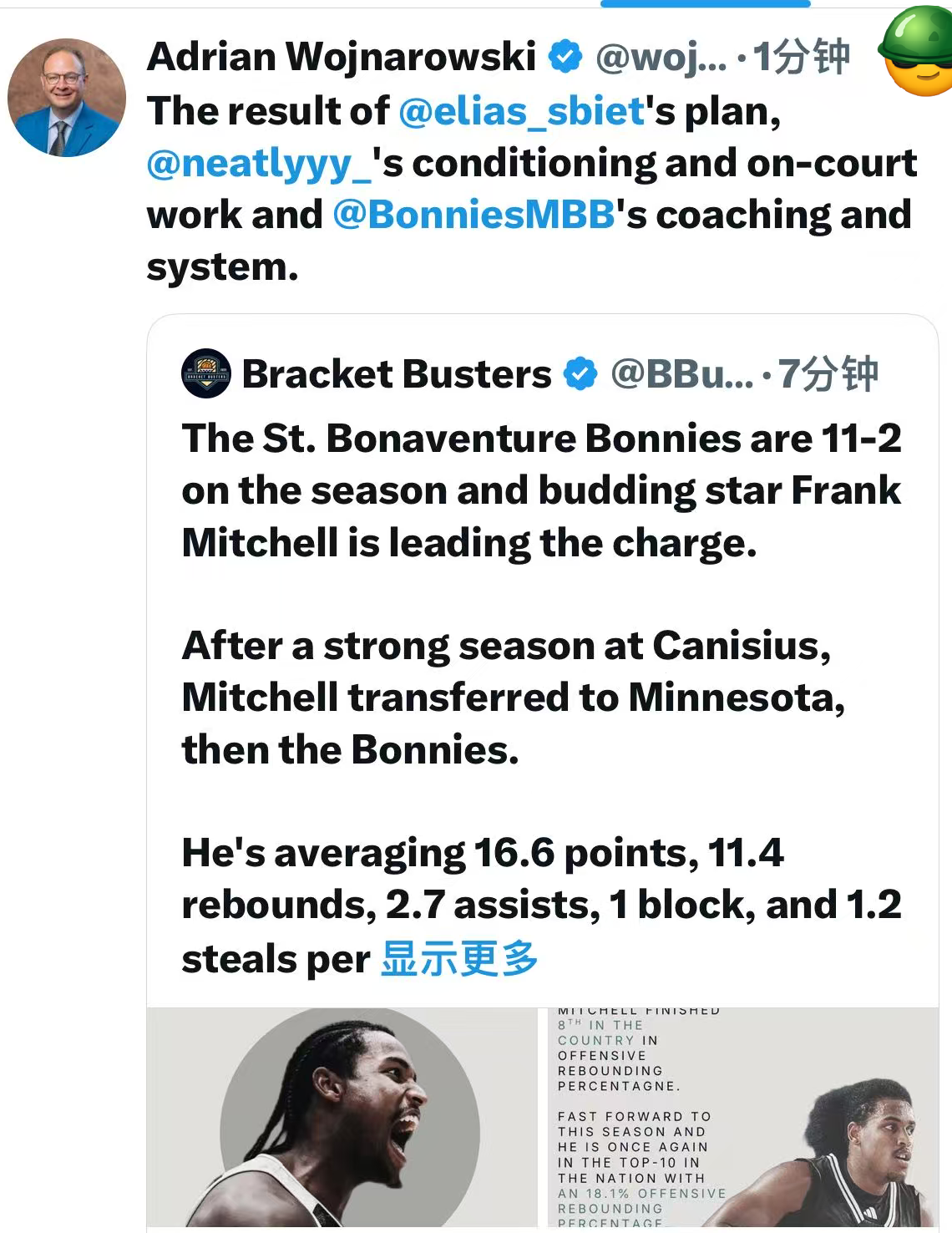 在Shams之前,NBA中最为权威的记者无疑是Woj,不过虽然他退休,人们已经很久没有从他口中听到关于NBA的消息了。 不过最近,Woj连续在社交媒体上,评价了一些NCAA表现出色的球员,就如有媒体发布了圣伯纳文图拉大学在本赛季已经获得了11胜2负的成绩,尤其是队中冉冉升起的新星弗兰克-米切尔。 米切尔经过两次转学才来到圣宝纳纹图拉大学,本赛季他场均能得到16.6分11.4篮板2.7助攻1.2抢断1封盖,投篮命中率达到54.4%。 对此Woj就夸赞了圣伯纳文图拉大学的团队和训练方法等!
