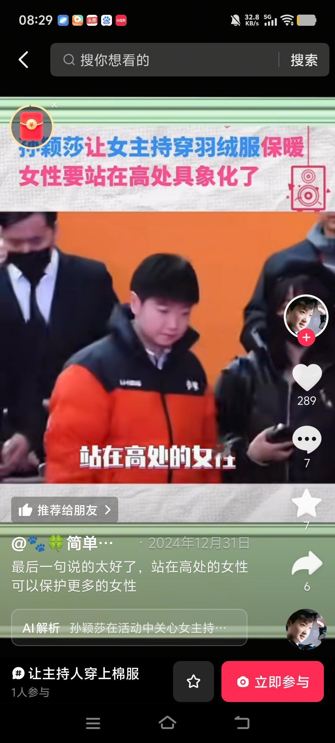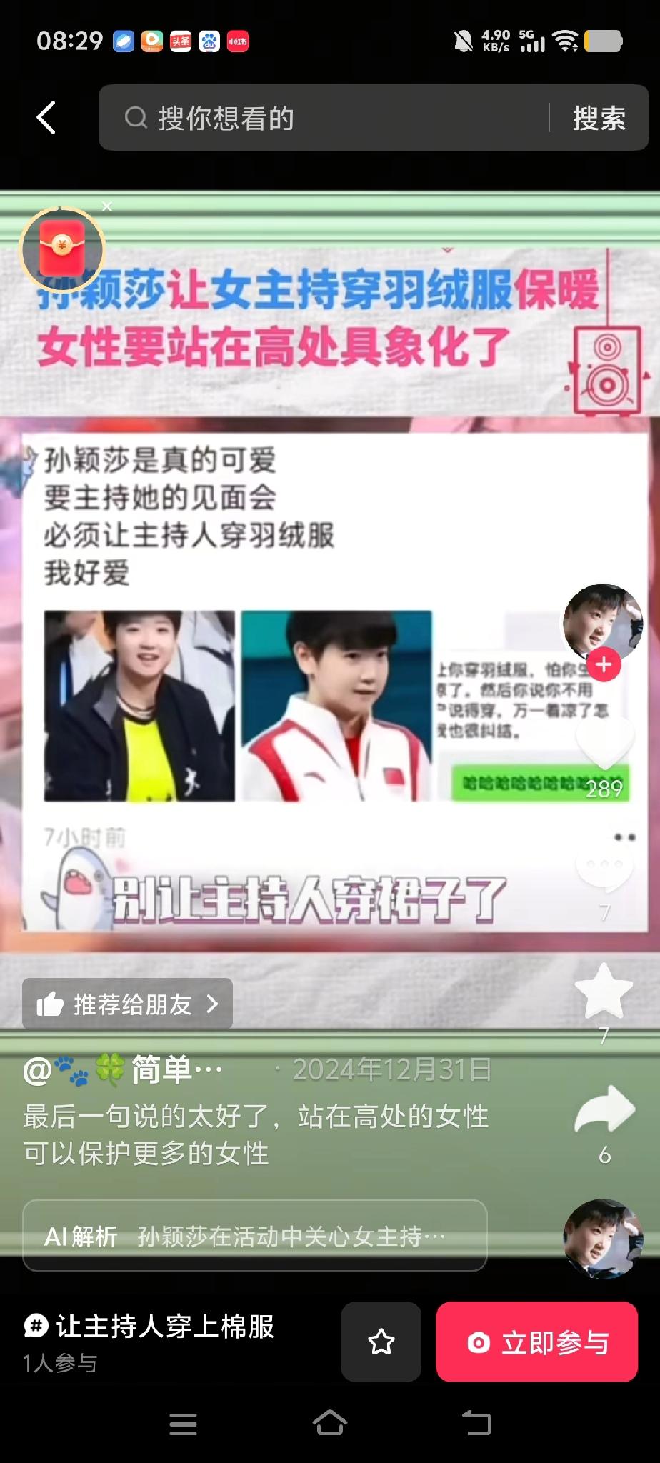 当我看完央视的跨年晚会, 我才真正意识到孙颖莎这个小姑娘有多么厉害 在这寒冬腊月的时节,户外寒风刺骨,大家出门出门都恨不得把自己裹成“粽子”。可咱们印象里,主持活动的女主持人总得穿着精致的礼服,哪怕冻得哆哆嗦嗦也得保持“美丽冻人”。就像老话说的“人靠衣装马靠鞍”,可这“鞍”要是冻得人直打颤,那还能好好“装”吗?你说这事儿怪不怪? 前阵子,乒乓球名将孙颖莎出席一场户外活动,眼瞅着天儿冷,女主持人穿着单薄,她二话不说就让主持人穿上羽绒服保暖。这可不是件小事儿,要知道这位女主持人干这行多年,上过大大小小无数舞台,头一回碰到有人让她穿羽绒服上台。孙颖莎这一举动,就跟冬日里的暖阳似的,把女主持人的心都给暖化了。无独有偶,在2024年巴黎奥运会上,跳水皇后郭晶晶担任跳水项目裁判长,她站在裁判席的高处,公平公正地执裁,让运动员们能在赛场上安心比拼。 你看,孙颖莎和郭晶晶,她们在各自的领域站到了高处,一个用暖心的举动保护了身边的女性,一个用专业的态度守护了赛场的公平。这就让我们明白,当越来越多的女性能够站在高处,她们不仅能活出自己的精彩,更能像一束光一样,照亮并温暖更多女性的路。所以啊,咱们盼着有更多女性能在各个领域崭露头角,因为当她们站得高了,那股子温暖和力量,就能让更多姐妹在人生的赛道上,活得更自在、更有底气!