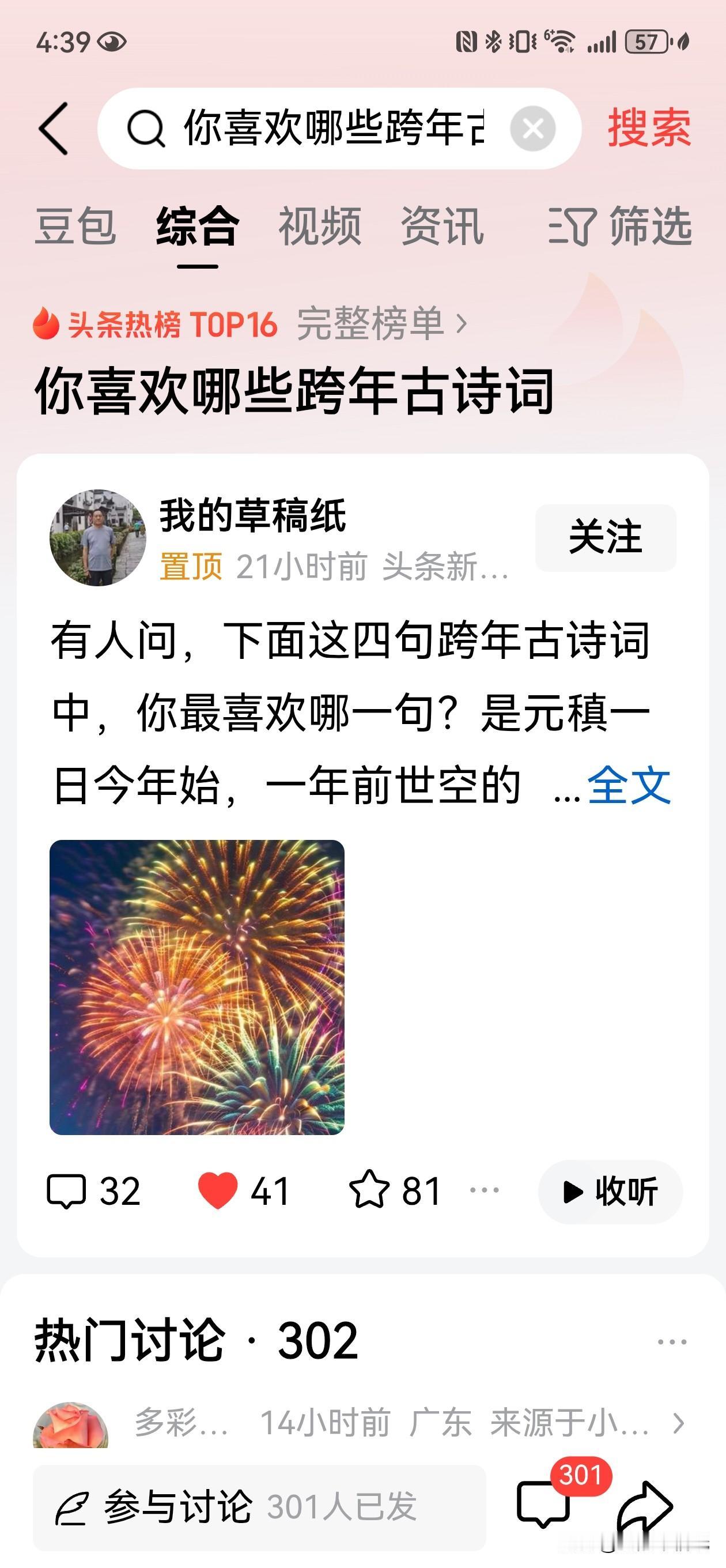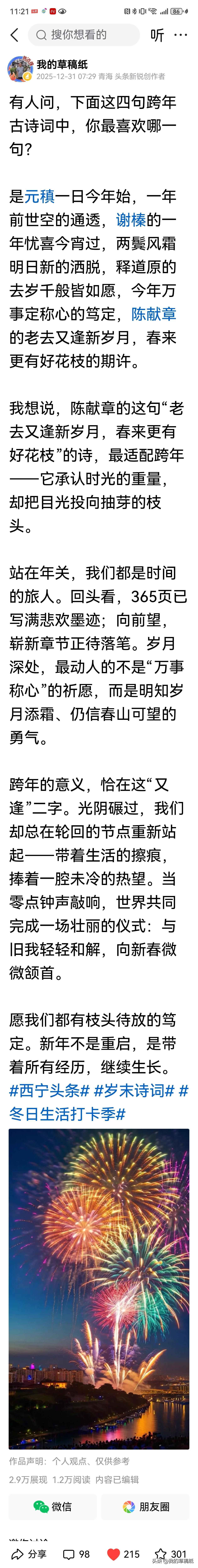 昨日一篇小文竟登上第16位,实在意外又欣喜。 跨年之际,随手整理了几句喜爱的古人跨年诗词,并写下些许感想。发布之初阅读寥寥,未料今晨醒来,数据悄然过万,还挂上了热榜。 古人没有“跨年”之说,却常以诗词铭刻岁末年初的心绪。一联一句,尽是时光流转中的感怀与眺望。而今人迎新,多读媒体献词,个人提笔咏怀者渐少。于是想起那些安静躺在时光里的句子,重新拾起,配上零星感言,不过是一次浅尝与致敬。 能引起诸多朋友共鸣讨论,于我已是莫大鼓励。年岁交替,诗意不息。或许我们需要的,正是这般与古今相照的片刻。