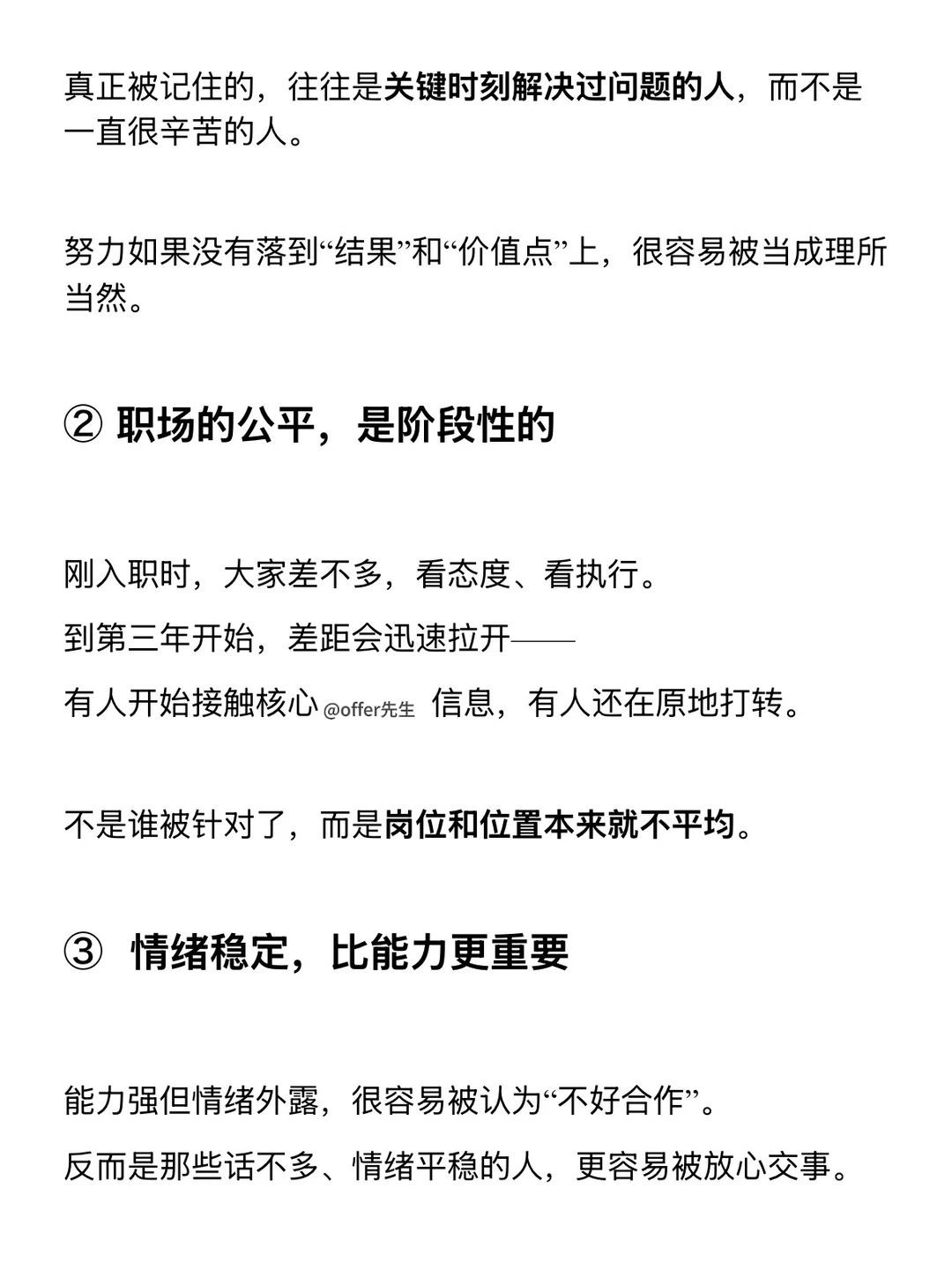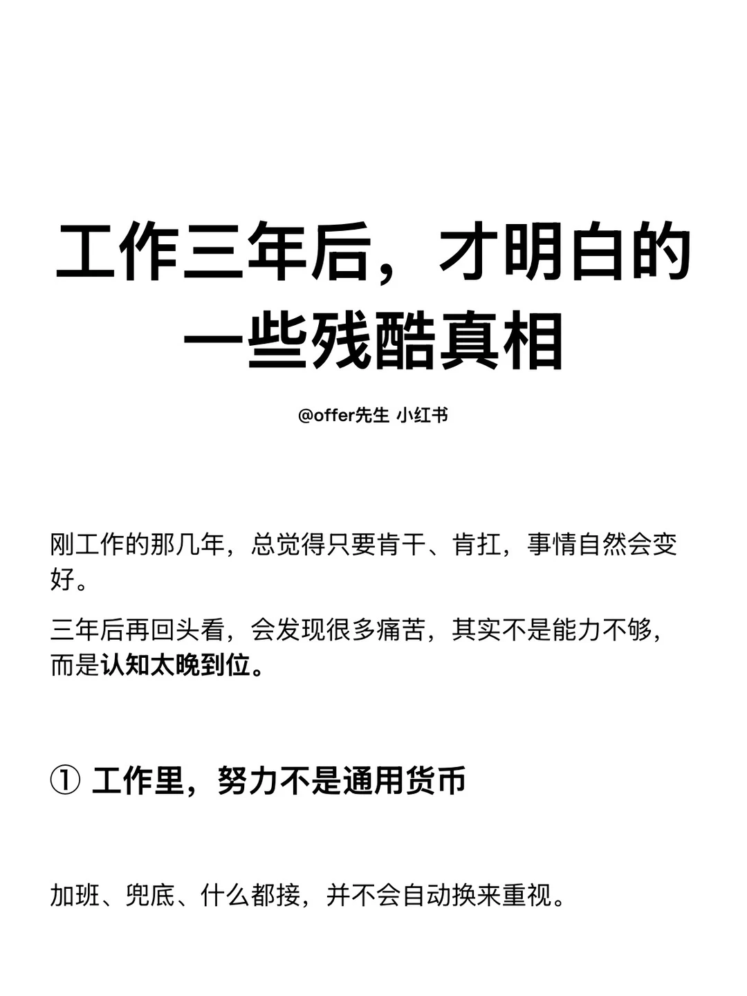 刚工作的那几年,总觉得只要肯干、肯扛,事情自然会变好。 三年后再回头看,会发现很多痛苦,其实不是能力不够,而是认知太晚到位。 … 一个认真分享“找工作”干货的账号,真诚、有料、不说空话 ·