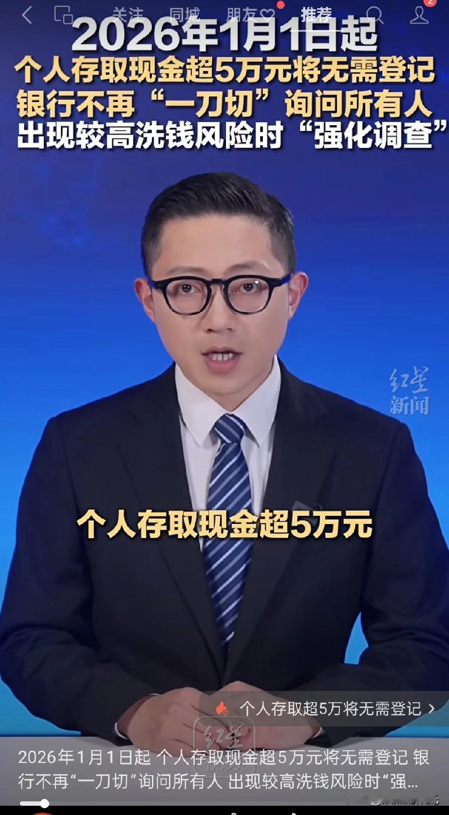 好消息来了! 2026年1月1日起,存取现金超5万不用登记啦! 这真是一个好消息,2026年1月1日开始,个人去银行存取现金超过5万元,再也不用做登记了! 之前去银行办大额现金业务,不管什么情况,银行都会“一刀切”地询问资金用途,现在这个规定改了。银行不会再对所有人都逐一追问,只有在发现交易存在较高洗钱风险时,才会进行强化调查。 这一调整既简化了咱们普通人的现金存取流程,不用再费时间填资料、做说明,又能精准防范洗钱等金融风险,兼顾了便利和安全。以后办大额现金业务,省心多啦! 大家支持这种做法吗?欢迎评论区留言! 银行取钱新规定 银行存取款新规 银行取款新规