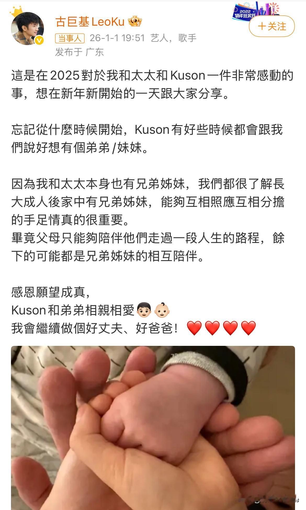 1月1日,古巨基官宣二胎生子! 引起一片哗然!要知道古巨基如今53岁,他的妻子陈韵晴52岁生一胎,58岁生二胎! 之前生一胎的时候,古巨基公开表示这是“医学奇迹”,并透露夫妻曾花费百万尝试辅助生育,时隔6年又生下2胎,医学奇迹好像变得不那么神奇了,古巨基发文称二胎计划源于长子长期渴望手足陪伴,夫妻双方都有兄弟姐妹,认同兄弟姐妹情谊很重要! 理是这么个理,但事属实是个奇事!