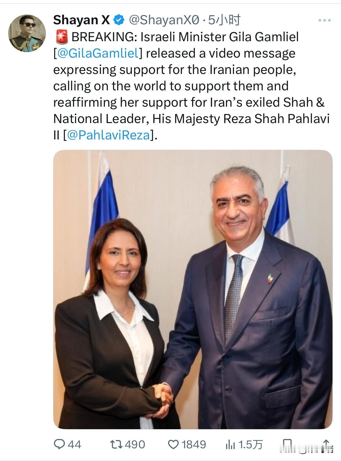 突发新闻:以色列创新、科学与技术部部长(Minister of Innovation, Science and Technology)吉拉·加姆列尔(Gila Gamliel )发布视频信息,表达对伊朗人民的支持,呼吁世界支持他们,并重申她对伊朗流亡国王兼民族领袖礼萨·巴列维二世陛下(PahlaviReza)的支持。 加姆列尔在政坛以坚定的右翼立场著称,近期在 2025 年底至 2026 年初的伊朗抗议活动中,公开支持伊朗的民主变革。