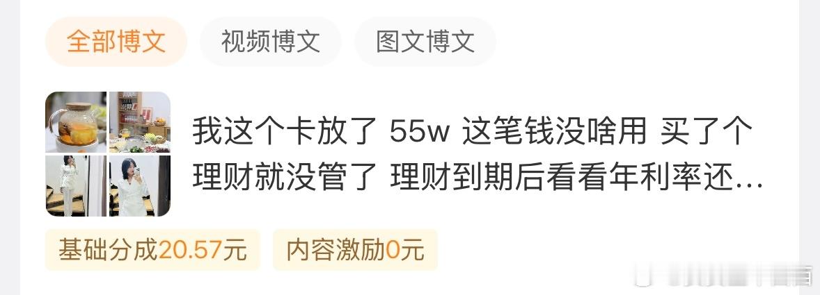 我以后要多多发理财内容了毕竟基金有赚有亏搞半天收入不一定为正但微博给的钱是实打实放入口袋的前几天看着收入高兴随手发的一篇没想到数据挺好,还有钱拿