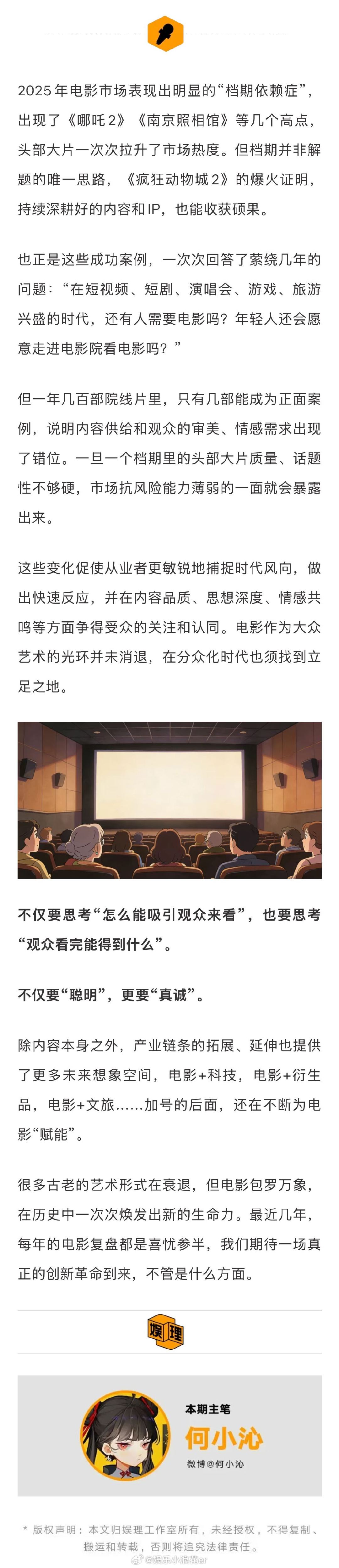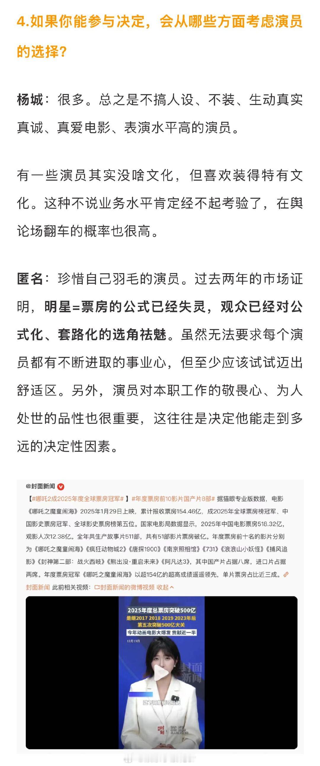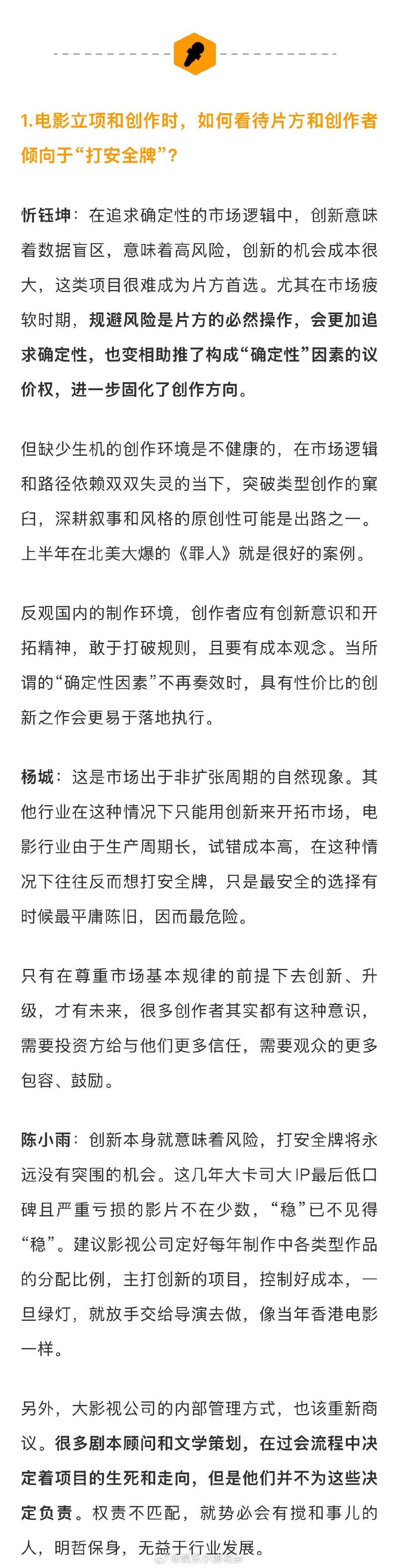 业内谈电影票房和口碑不成正比 业内更偏爱珍惜自己羽毛的演员 谈及电影在立项或创作时,更倾向于“打安全牌”的问题,导演忻钰坤直言:在追求确定性的市场逻辑中,创新意味着数据盲区和高风险,创新的机会成本很大,这类项目很难成为片方首选。尤其在市场疲软时期,规避风险是必然操作,也变相助推了构成“确定性”因素的议价权,进一步固化了创作方向。娱理独家↓