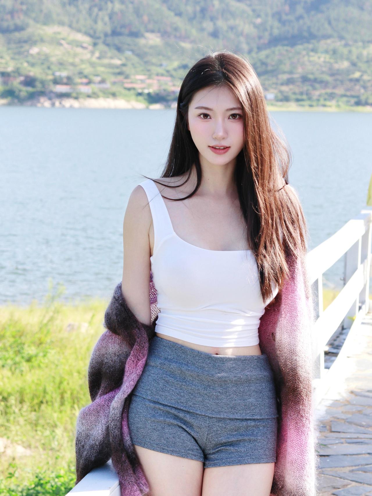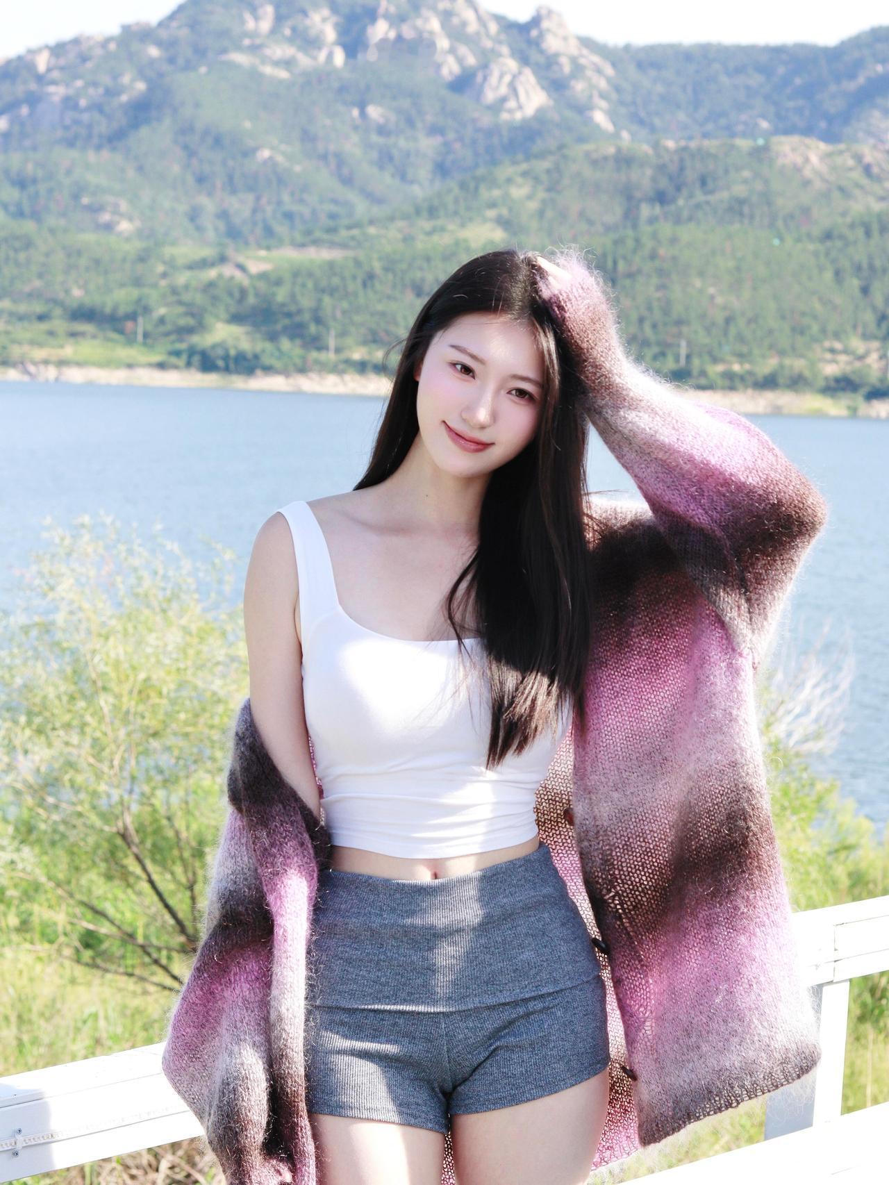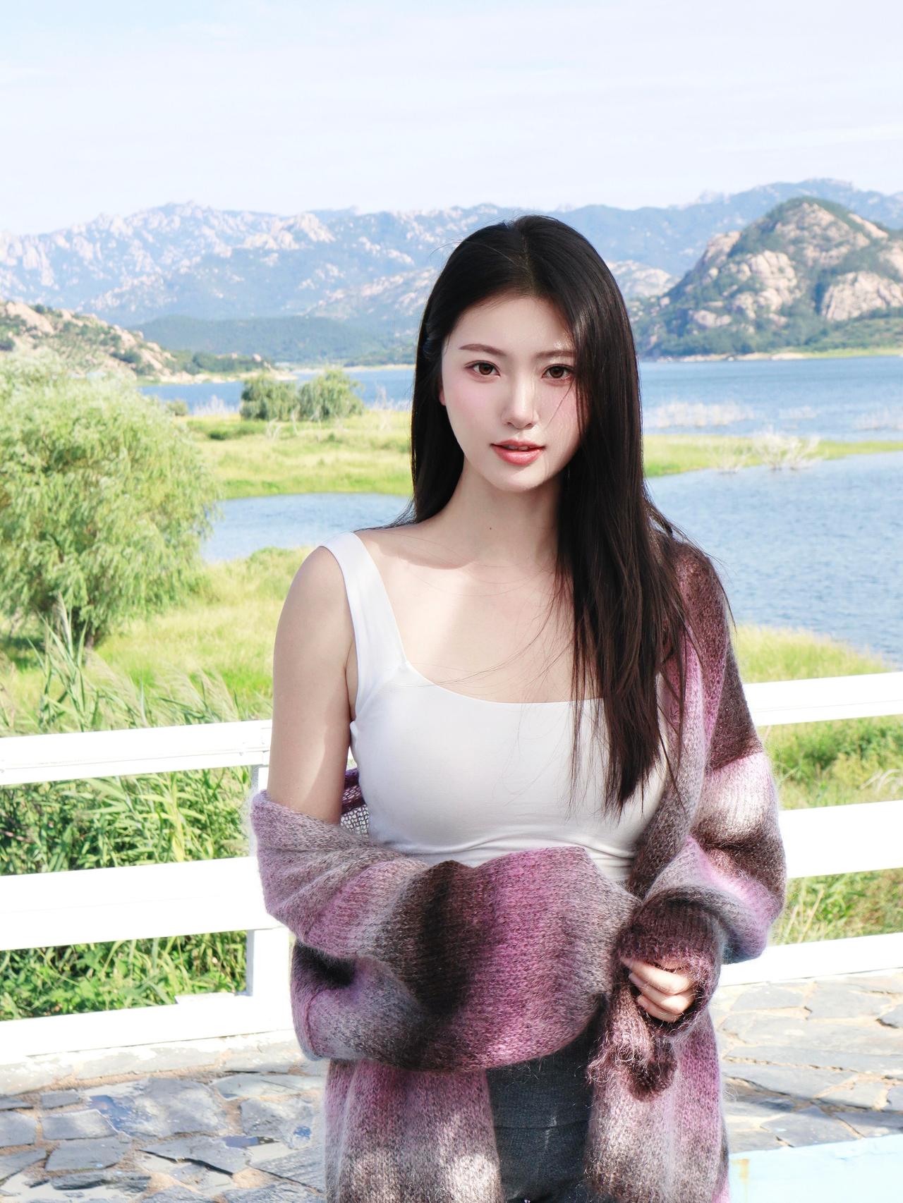 《 湖畔的紫粉温柔》原创诗词 原创看图片配诗 湖光山色漾晴柔,紫袂拂汀洲。 白衫轻衬云影,风软绕肩头。 山叠翠,水横流,意悠悠。 凭栏凝睇,一襟清晓,漫惹闲愁。