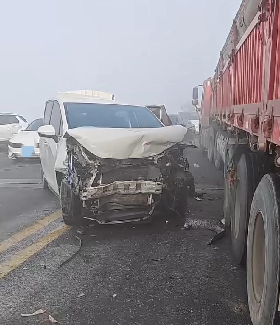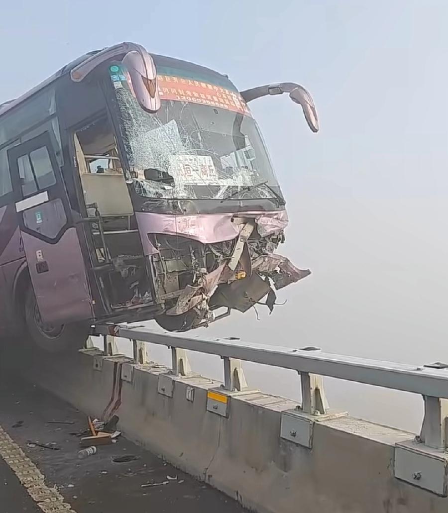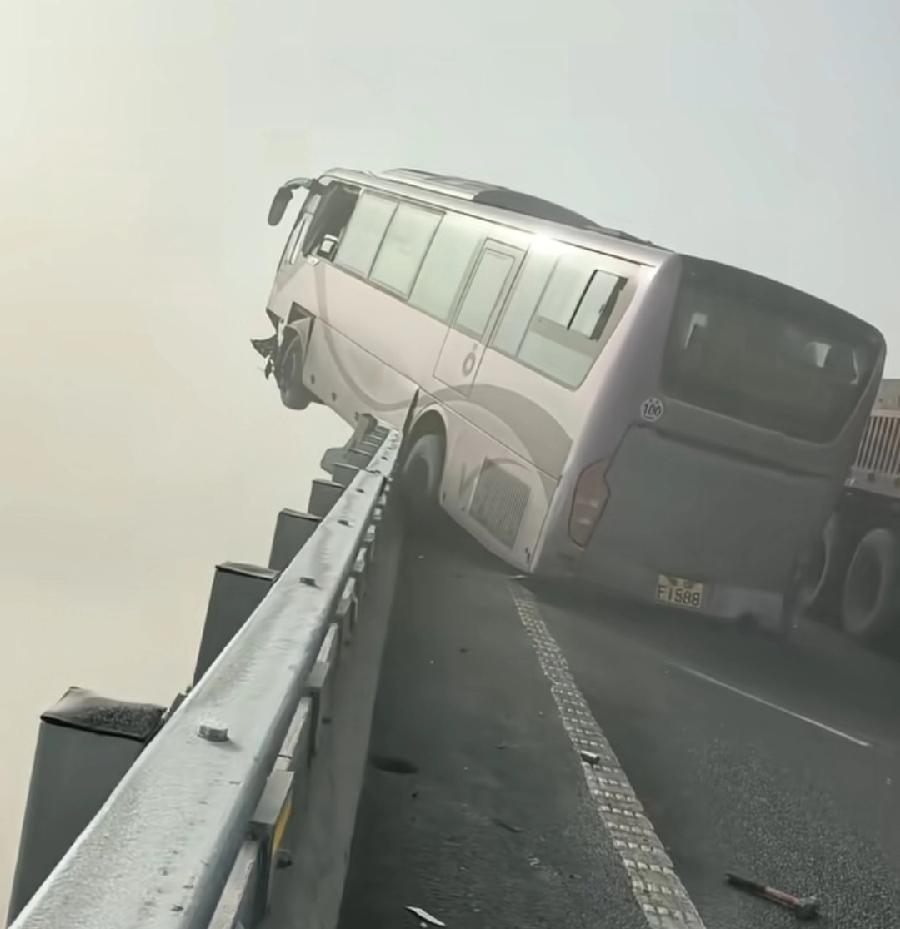开封黄河大桥多车相撞,一辆长垣到商丘的大巴车,差点掉下去!整个车头、前车轮都悬空翘起来了,半个车身骑在栏杆上!万幸栏杆够结实,基座是水泥石墩,上面铁杆也够硬,左后轮卡在栏杆上,否则滑下去后果不敢设想!大巴司机、整车旅客肯定吓得不轻!事发原因,因为大雾,视野差,雨雪天气又滑!提醒所有车主,谨慎小心驾驶,安全第一!
