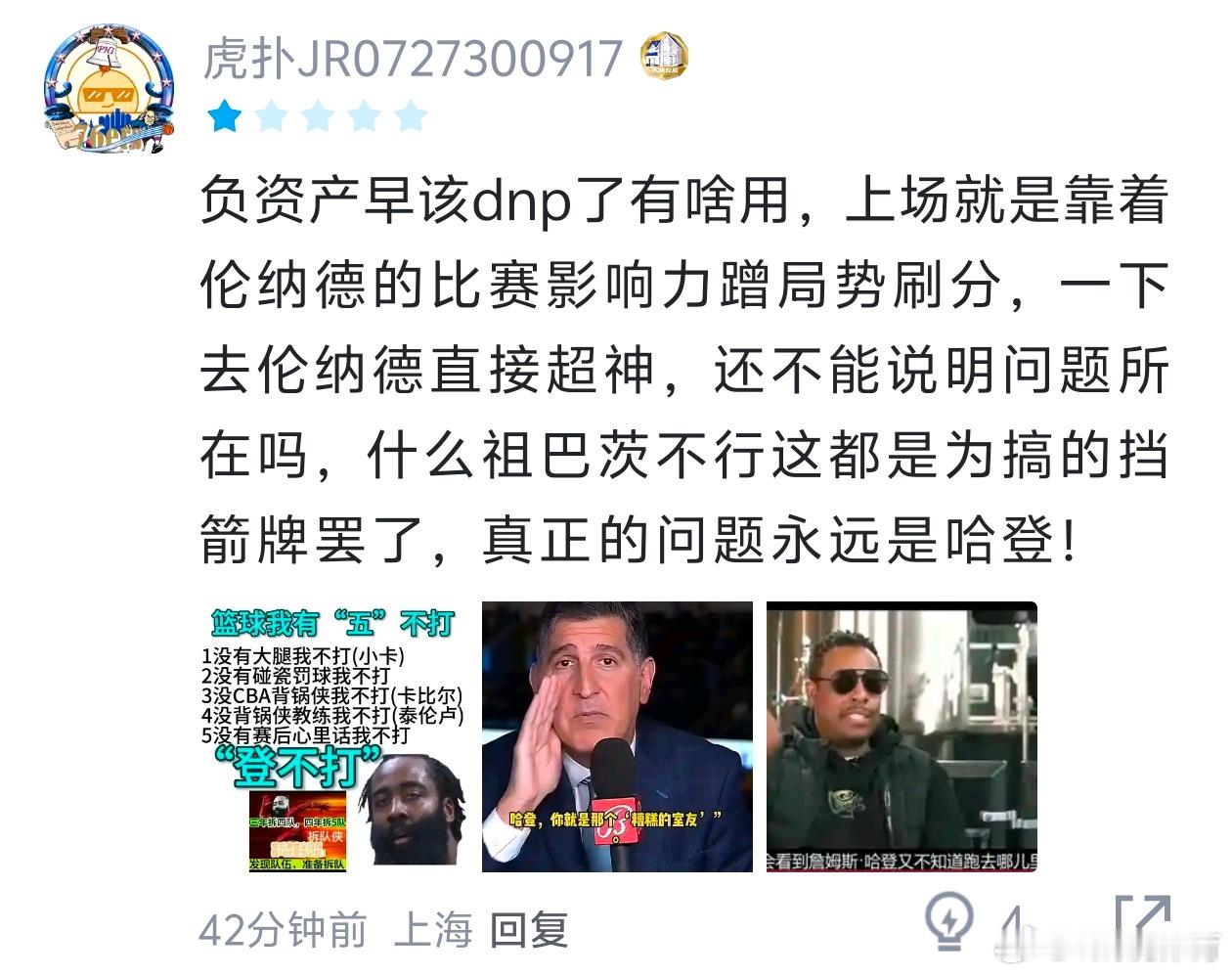所以哈登开局上的时候赢20分不是赢?第四节不过是快船起势了,结果已经可以盖棺定论了,所以哈登不上了而已,到了你这就搞分化了是吧