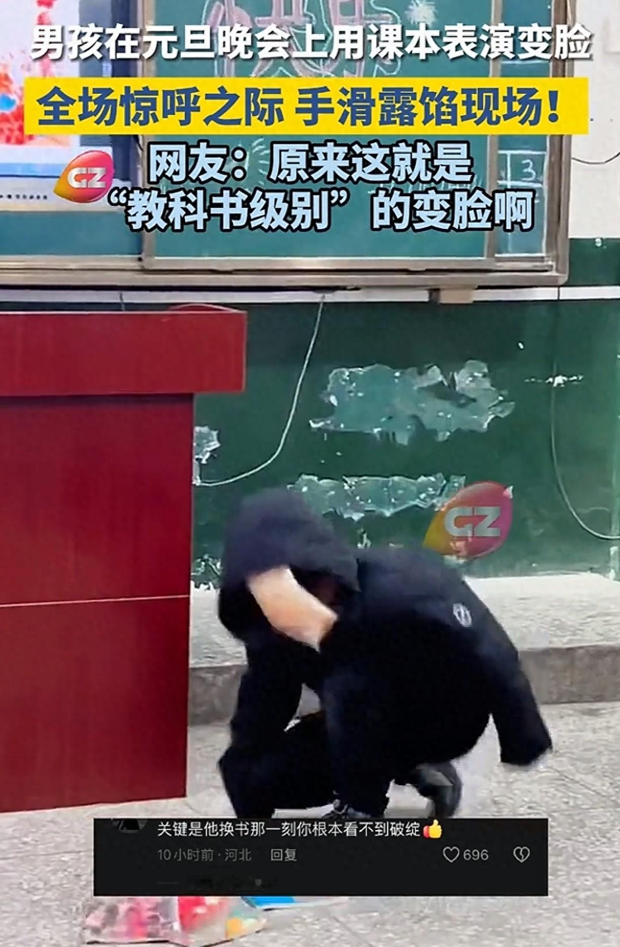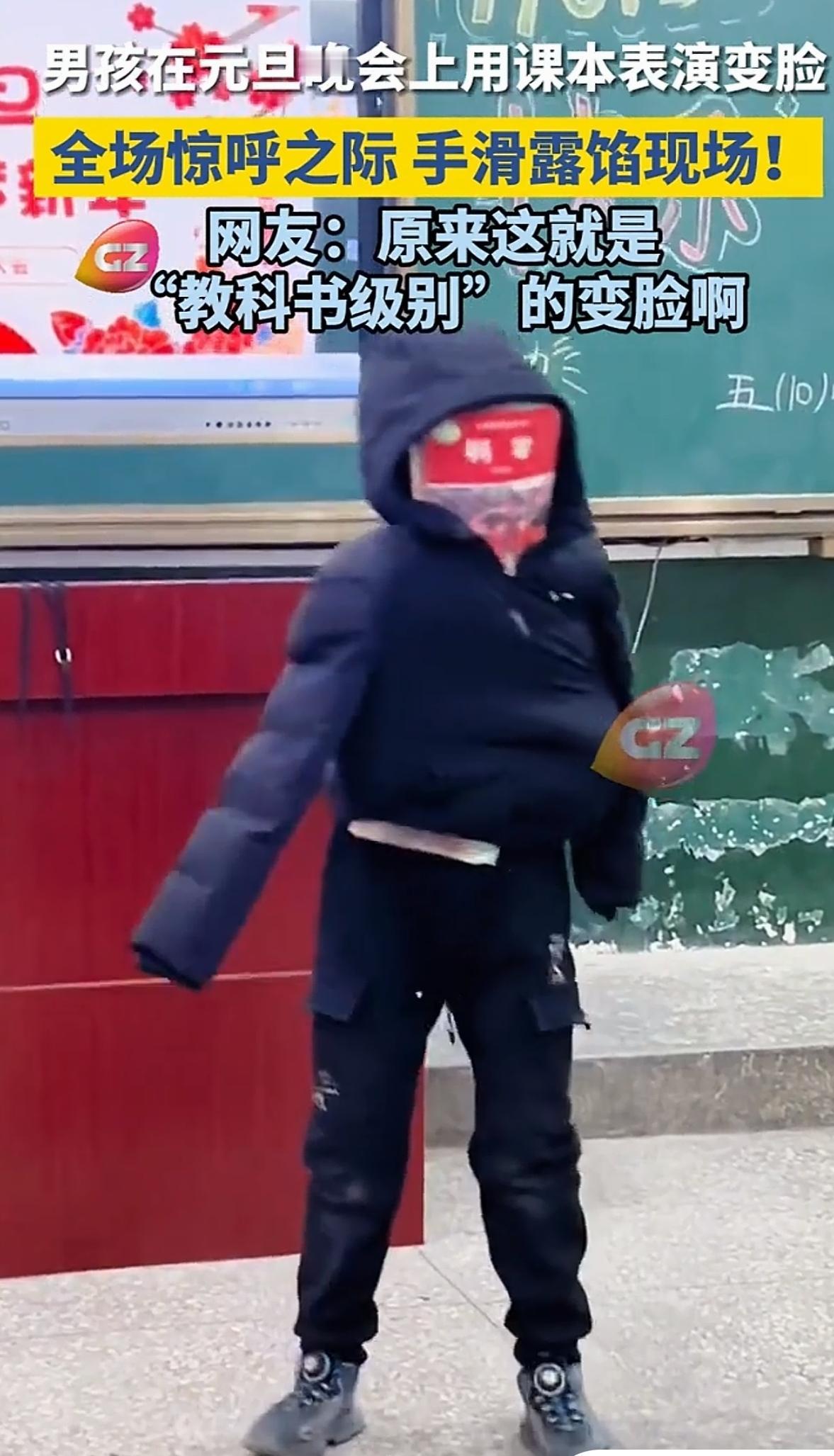 太有才了!小学元旦晚会上,一名男生上台表演“变脸”的节目,不过有趣的是,他变得不是“脸”而是书本,一件羽绒服加上几本书却把变脸的原理给演明白了,最后的失误更是成了点睛之笔。网友:原来这就是教科书级别的变脸啊。 12月31日的校元旦晚会上,舞台光打得透亮,没有什么锣鼓喧天的专业伴奏,主角也就是个裹得严严实实、看着稍显笨拙的小男生,可当他往那一站,那种属于孩子的野生创造力,瞬间就把场子给镇住了。 这大概是史上最接地气的一次“变脸”尝试。传统川剧里,那是把脸谱画在绸子上,讲究个“抹、吹、扯”,一张张面具之下藏着不传之秘。但这孩子不走寻常路,人家变的是手里那厚厚的教科书。 你看他在台上的那个范儿,连体帽衫往头上一扣,宽大的羽绒服反而成了最好的遮掩。 音乐踩着点走,小家伙身形一晃,右手把帽檐利索地往下一拉,左手就在那个瞬间往怀里一探一收。没有任何多余的烟雾弹,就借着袖子晃动的那一下视觉盲区,手里拿的书,封面变了。从一本换到另一本,节奏感那是相当丝滑,甚至带着几分戏剧性的张力,仿佛他怀里揣的不是寒假作业的预告,而是真真切切的川剧机关。 其实要把这事儿说明白,还得聊聊老祖宗的手艺原理。在那行云流水的川剧变脸背后,往往藏着精心设计的引线,要么是舌尖顶着机关,牵一发而动全身;要么是藏在头饰后的回拉线,一扯就能把薄如蝉翼的面具瞬间顺走。这孩子虽然还是个小学生,但显然是钻研过这里面的门道的,他没法在那一身羽绒服里装弹簧引线,却巧妙地把衣服本身变成了一个巨大的“机关”。 那一刻,羽绒服蓬松的轮廓替他挡住了所有可能的穿帮视角,课本交替的瞬间,就是他“扯脸”的高光时刻。 一、二、三,台下的同学们都已经看入迷了,身子不由自主地往前探,惊呼声此起彼伏,毕竟在大家的认知里,课本这东西用来写作业都嫌沉,谁能想到还能拿来当道具玩出花儿来? 但也正是因为这“道具”的特殊性,给后面的意外埋了个伏笔。 就在表演进入最高潮,那个需要快速连续切换的节骨眼上,意外来了。或者是羽绒服的面料实在太过顺滑,根本挂不住重物;又或许是那小小的手掌终究难以在极速转身中掌控厚重的书籍力度。 那一刹那,所有的技巧都在物理重力面前败下阵来,“哗啦”一声,原本藏在怀里准备惊艳亮相的、亦或是刚刚展示过的“脸谱”,全都挣脱了束缚,重重地拍在了地板上。 这就好比一位大魔术师正准备大变活人,结果箱子底漏了。那一秒钟的静默是尴尬的,因为原本是个不仅考验手速、还考验力度的技术活,如果不是身上穿得太厚重,如果手里拿的是特制的薄书皮而不是实打实的教材,这一出好戏绝对能让他一战成名,甚至到现在可能也没人能参透他是怎么换的书。 底牌漏了,魔术穿帮了,但这一漏,反而把全场的笑点彻底点燃了。那个原本气势十足的小演员愣了一下,低头看看这一地的狼藉,又抬头看看台下,那份独属于孩童的懵懂和随即而来的不好意思,连带着最后为了救场挤出来的笑容,反而成了整个晚上最真实的瞬间。 现场没有嘘声,全是善意的掌声和爆笑。视频流出后,更有眼尖的网友在屏幕前笑出了声,直言这才是真正的“教科书级别”的变脸,因为它不仅仅演示了变脸的快,还硬生生地演示了变脸的“难”。 如果是平时看专业演出,我们期待的是零失误的精准,那是对艺术的敬畏;但在这个小学的元旦舞台上,正是那双手一滑的瞬间,让表演有了温度。如果那个男孩真的毫无破绽地演完了全程,那充其量只是一次聪明而精准的模仿秀。可书本掉落的那一刻,那个惊慌失措后又强装镇定的身影,打破了表演的“第四堵墙”。 人们笑的,不光是那个失误,更是那种“明明看懂了原理却依然觉得可爱”的真实感。这一地散落的书本,不仅没有砸了场子,反而让这段视频在随后的一天里引发了无数人的共鸣。 大家在这一幕里看到的,不仅仅是对传统文化的另类致敬,更有一种难得的、冒着傻气却生机勃勃的少年心气。这或许才是节日晚会最该有的样子:不必完美,但一定要快乐。